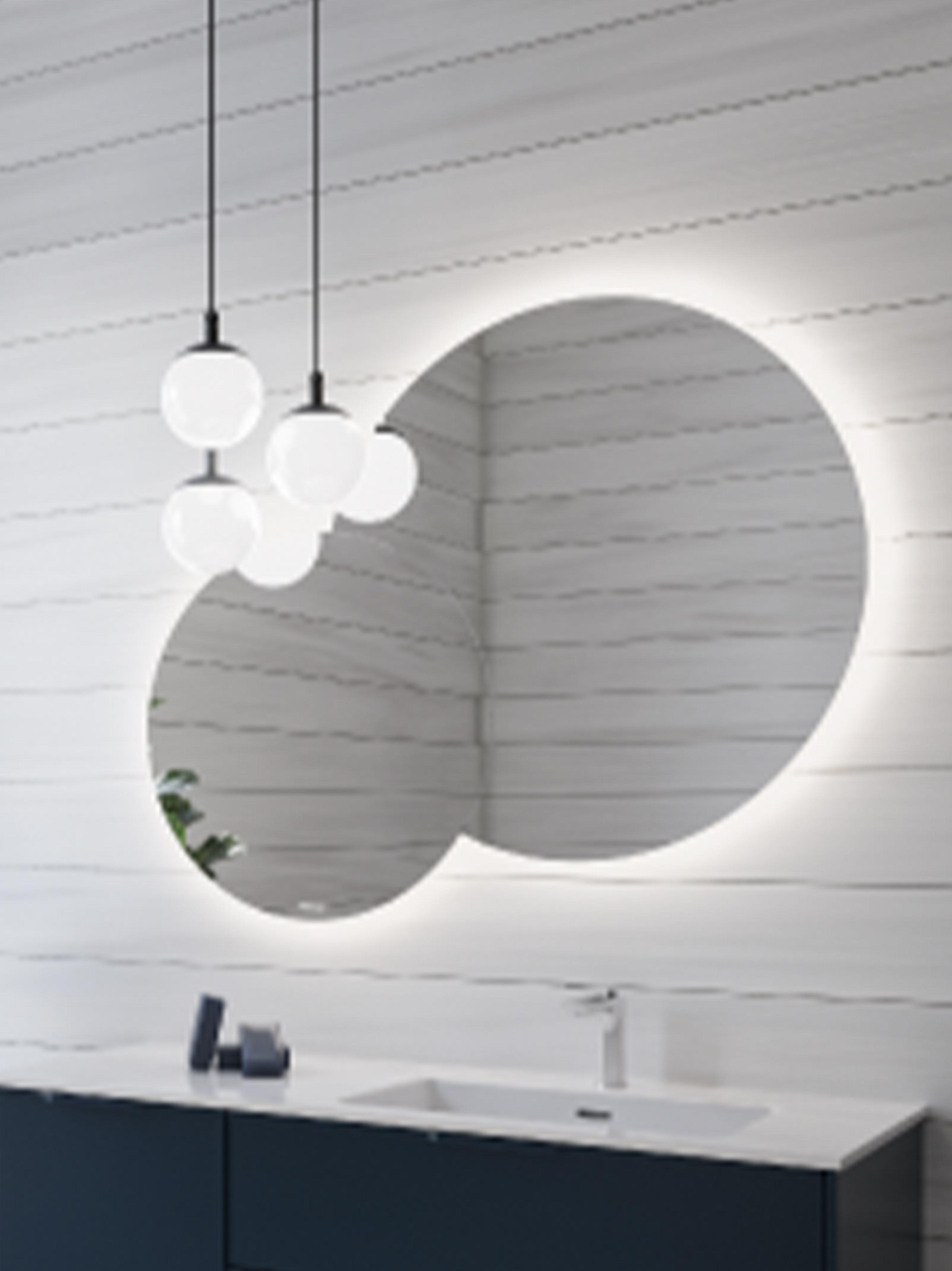 Baderomsmøbel i hvit ask som inkluderer servantskapet (100x45 cm) med plan front og push-open. Ise servant (100x45 cm) i hvit matt og Valje dobbel rundt (Ø60+80 cm) speil med LED-belysning. Pris inkluderer også Lodal servantkran i krom.