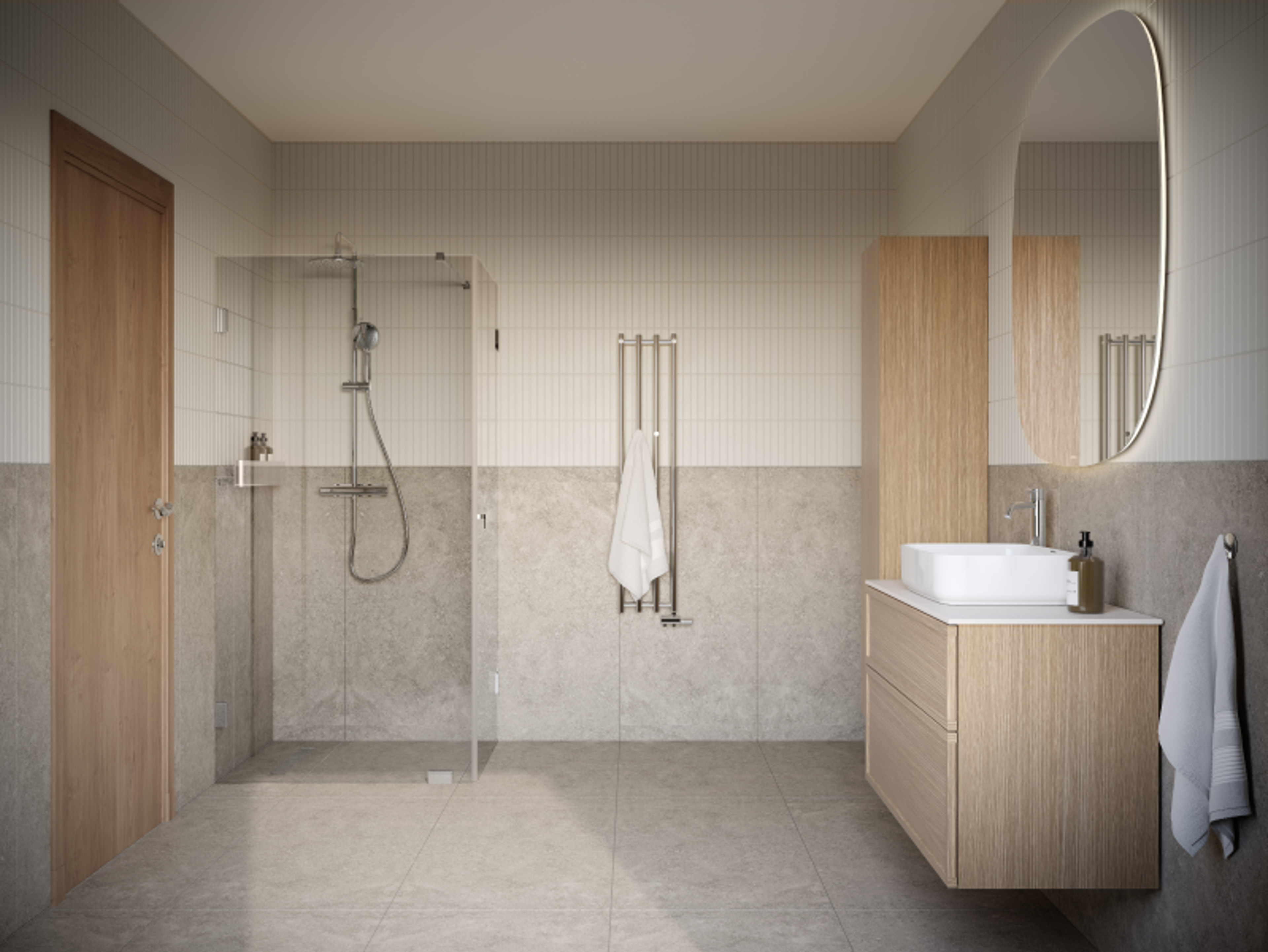 Oppbevaringskonsept som bygger fra en overflate til en annen og sørger for at produktene dine er lett tilgjengelige. Et horisontalt design som binder sammen forskjellige funksjoner og skaper helhet. Hylle i aluminium for plassering i eller utenfor dusjen. Fargene matcher fargene på Skoga Dusjløsninger.