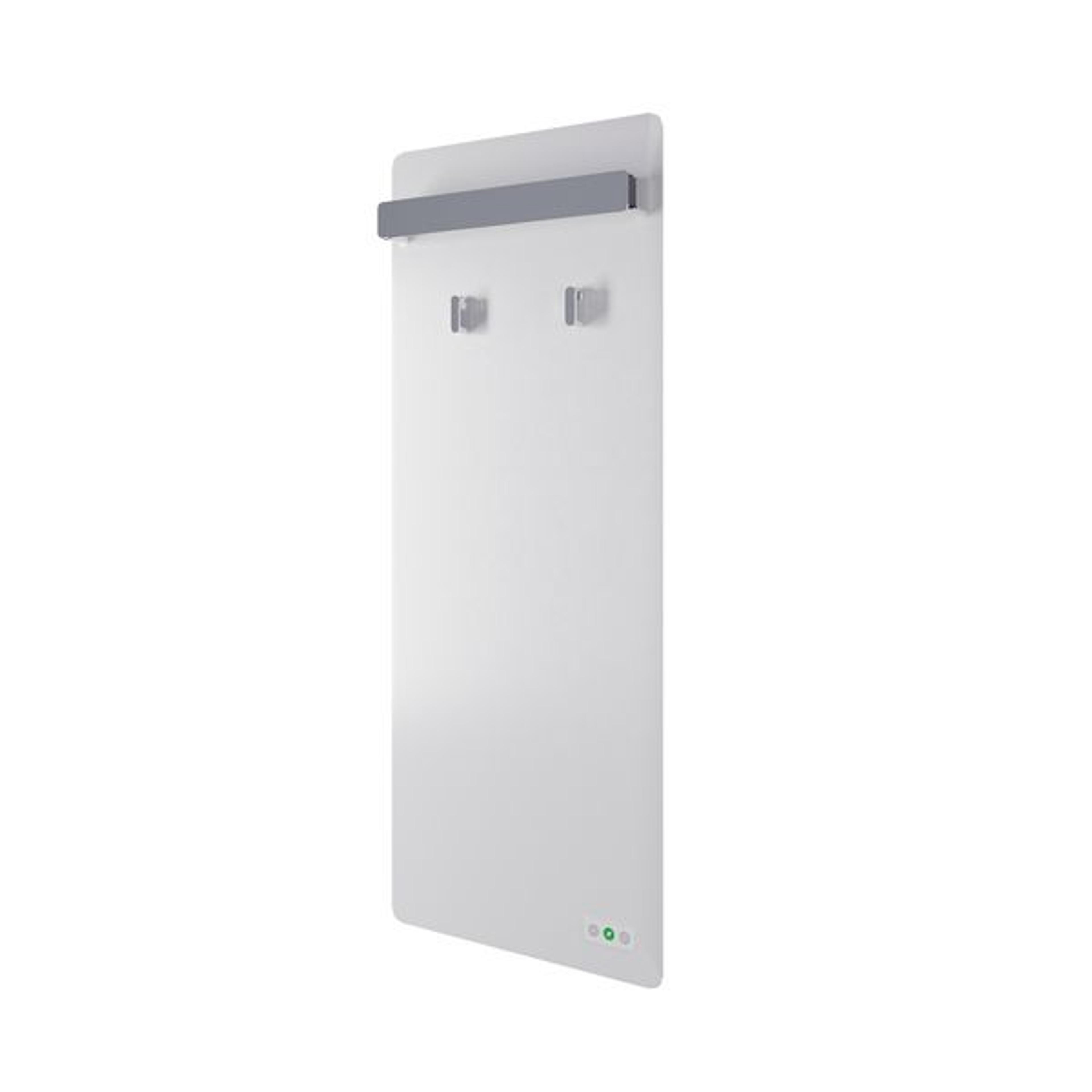 Innovativ håndkletørker med varmeoverføring og tørking via pulverlakkert stål. Skjult tilkobling for et rent, minimalistisk utseende og enkel styring i tre posisjoner med Eco-modus. Oppheng for badelaken og to kroker følger med. Design: Swift Creatives.