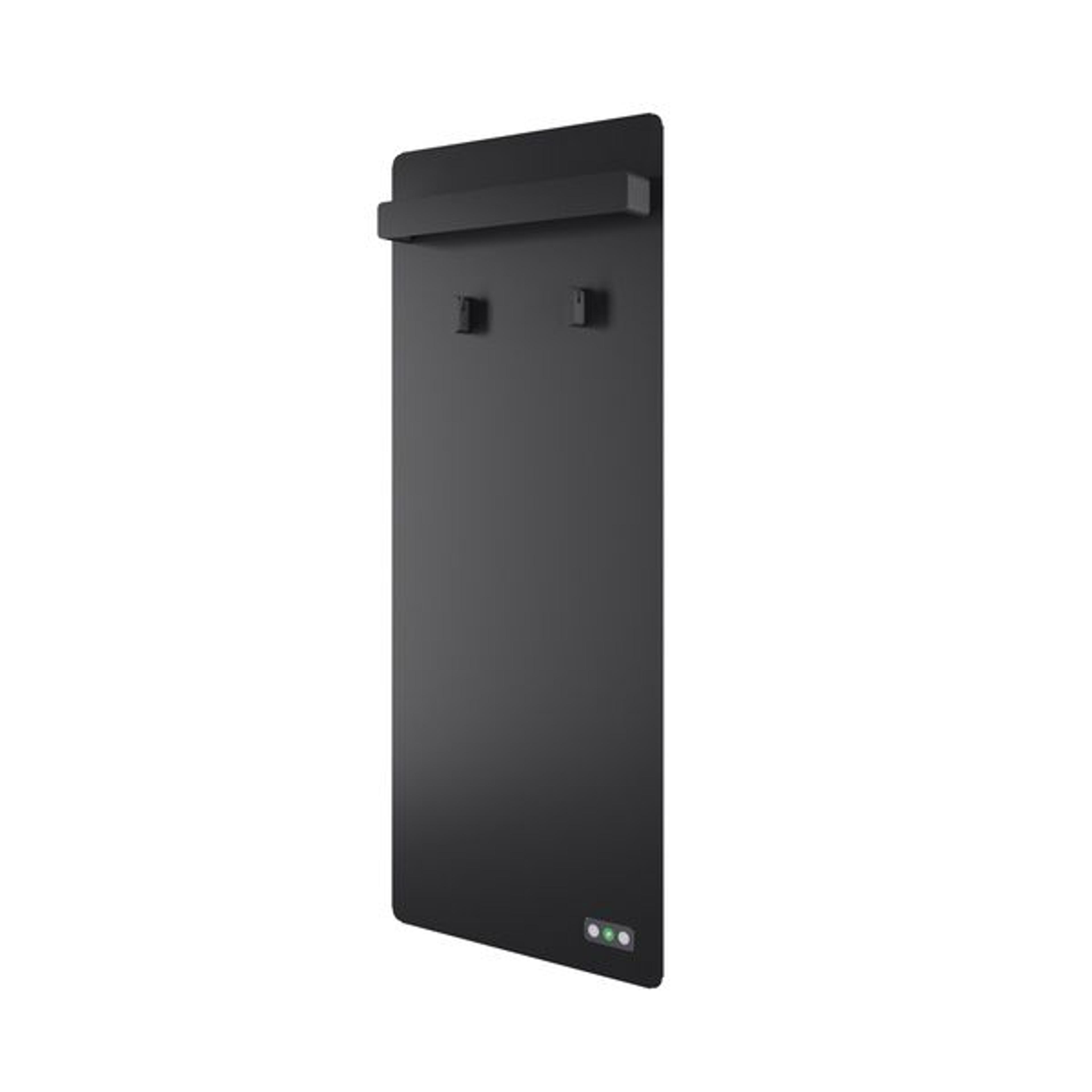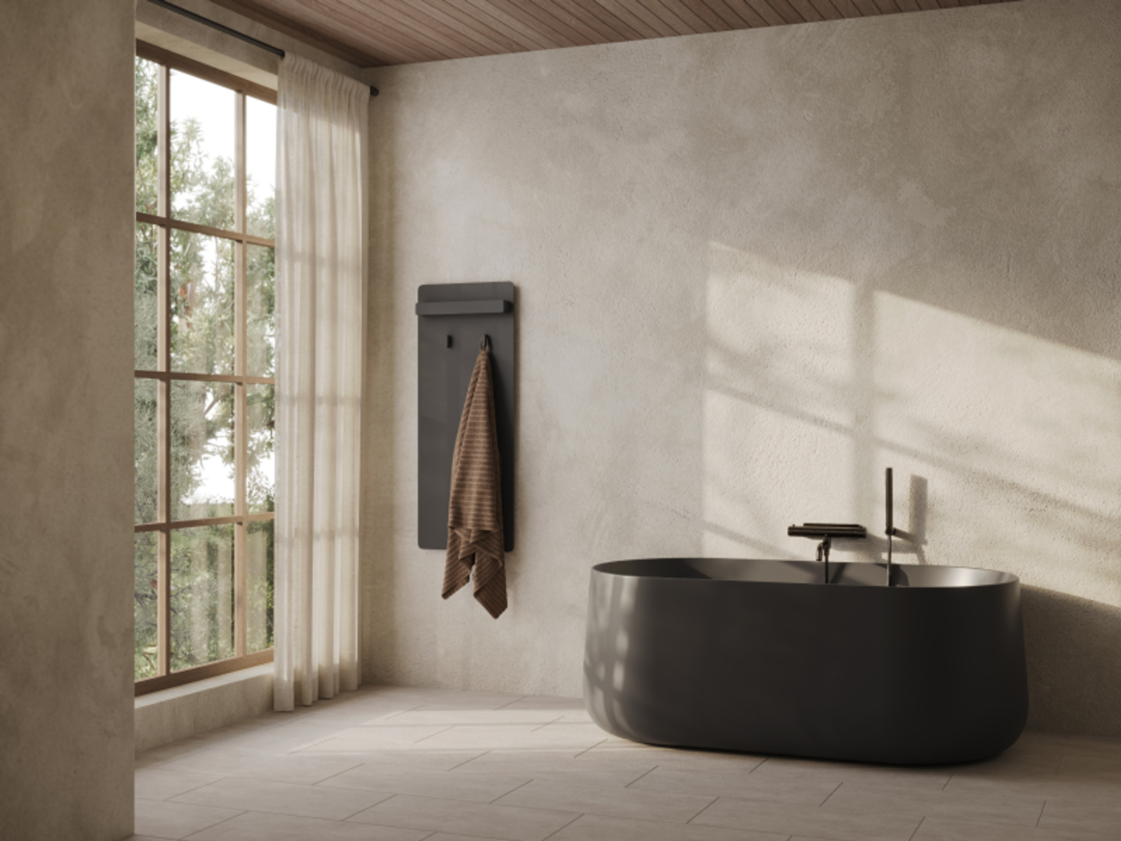 Innovativ håndkletørker med varmeoverføring og tørking via pulverlakkert stål. Skjult tilkobling for et rent, minimalistisk utseende og enkel styring i tre posisjoner med Eco-modus. Oppheng for badelaken og to kroker følger med. Design: Swift Creatives.