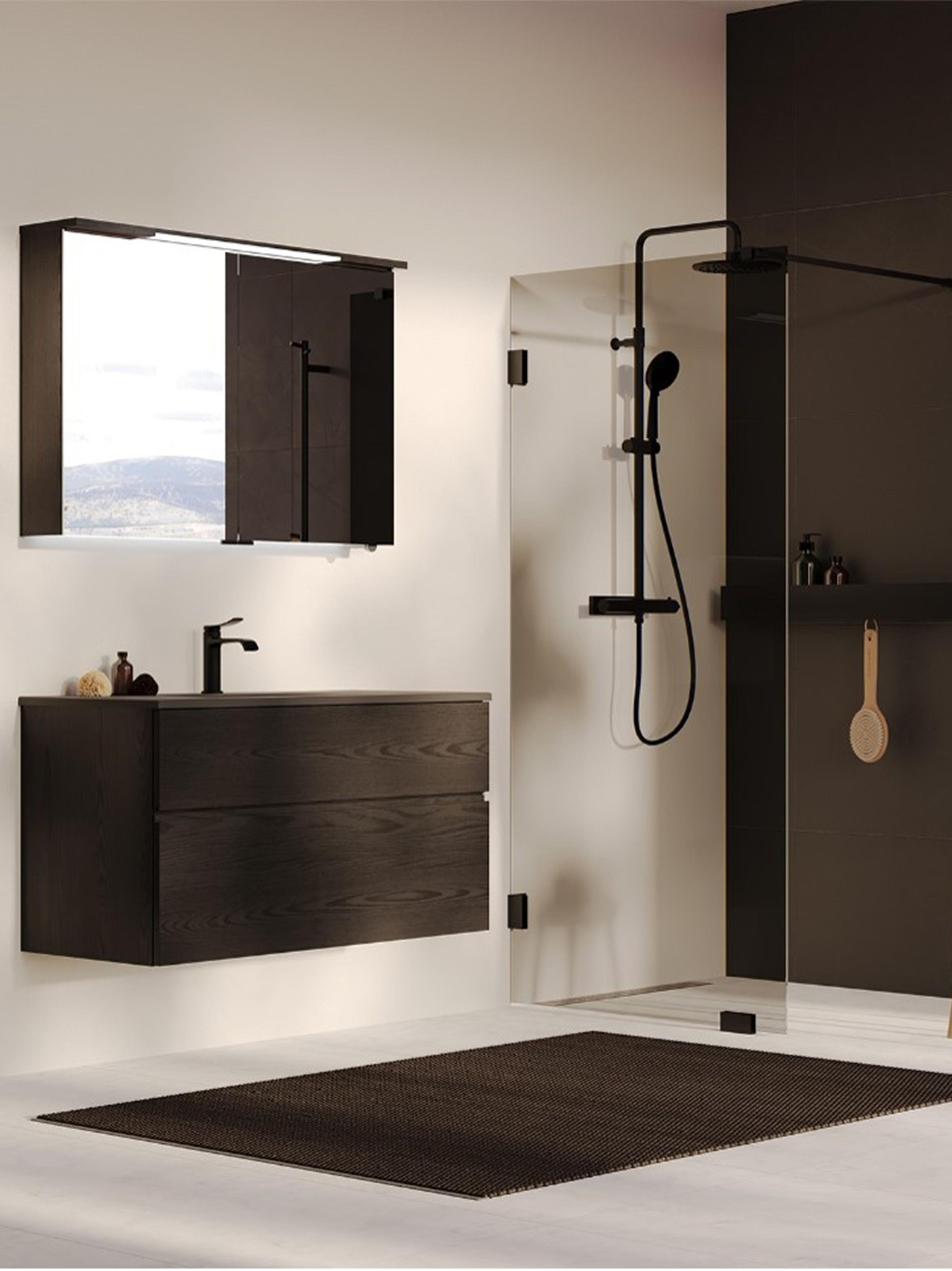 Baderomsmøbel i brun ask som inkluderer servantskapet (100x57x45 cm) med profil front, to skuffer og integrert håndtak. Sel servant (101x15x46 cm) i sort matt og Skuru speilskap (100 cm) med LED-belysning, strømuttak, to hyller og servantlys. Pris uten servantkran og høyskap.