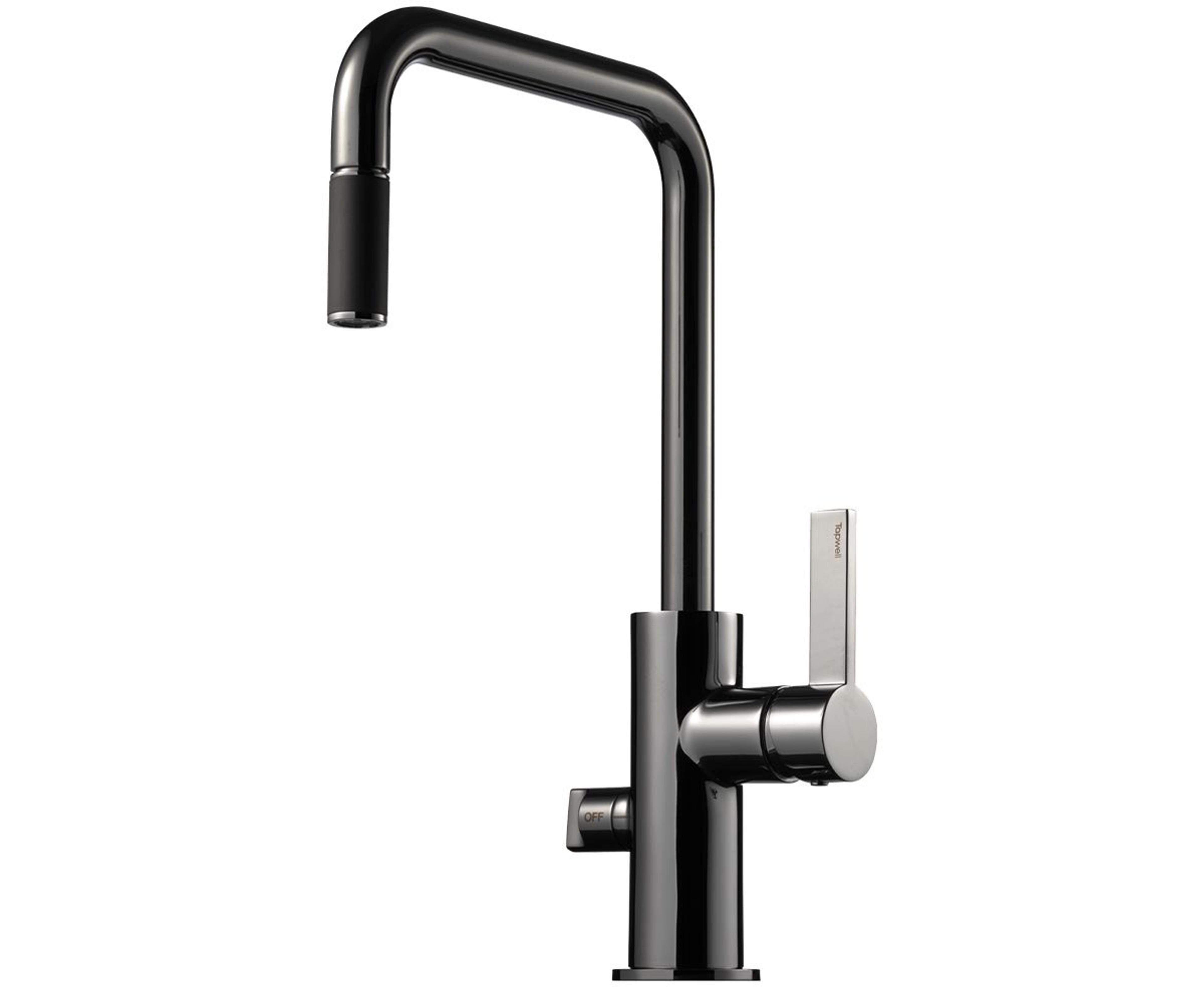 Kjøkkenbatteri med høy svingbar tut, avstengning for oppvaskmaskin og uttrekkbar hånddusj. Farge: Black Chrome