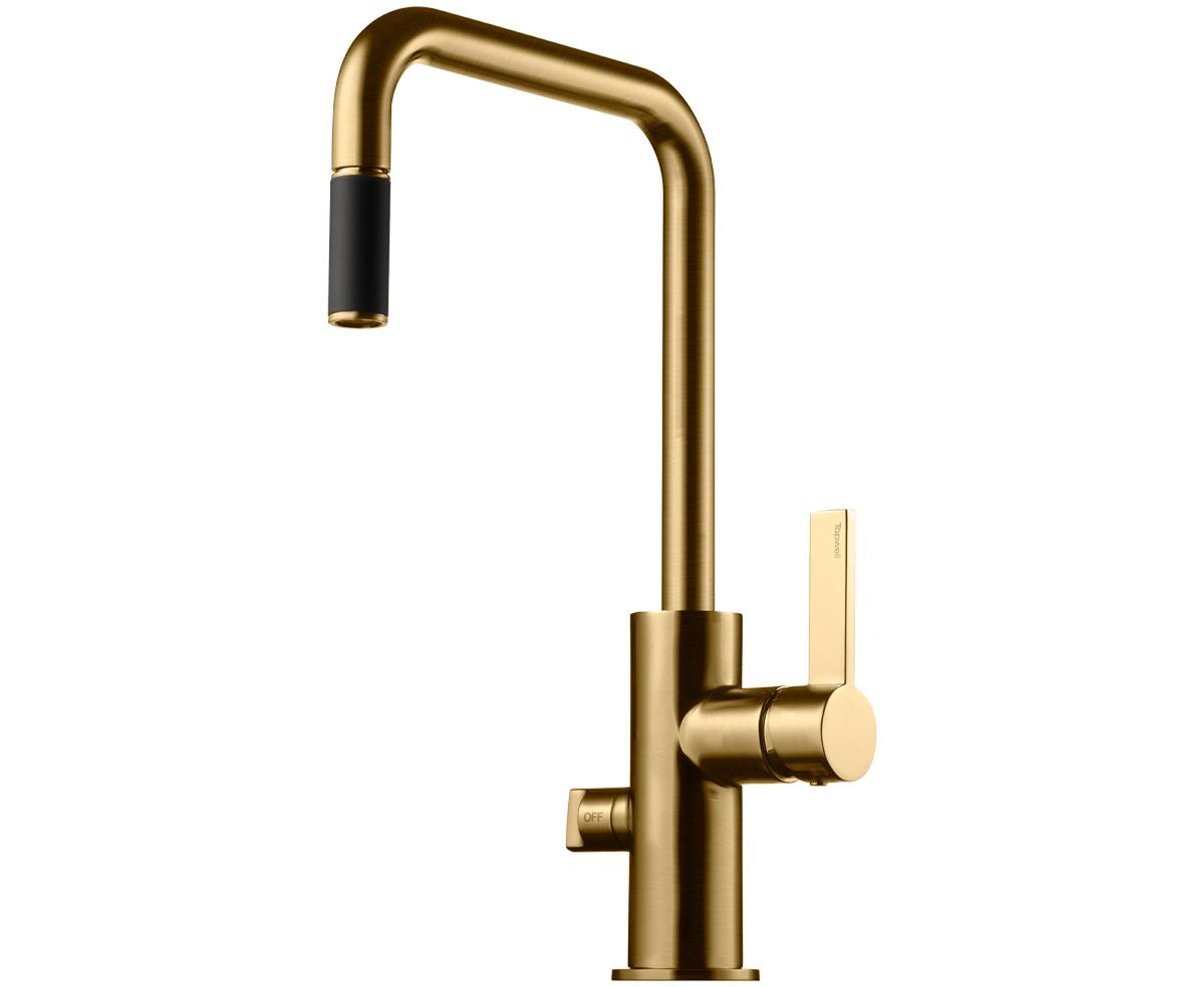 Kjøkkenbatteri med høy svingbar tut, avstengning for oppvaskmaskin og uttrekkbar hånddusj. Farge: Brushed Honey Gold