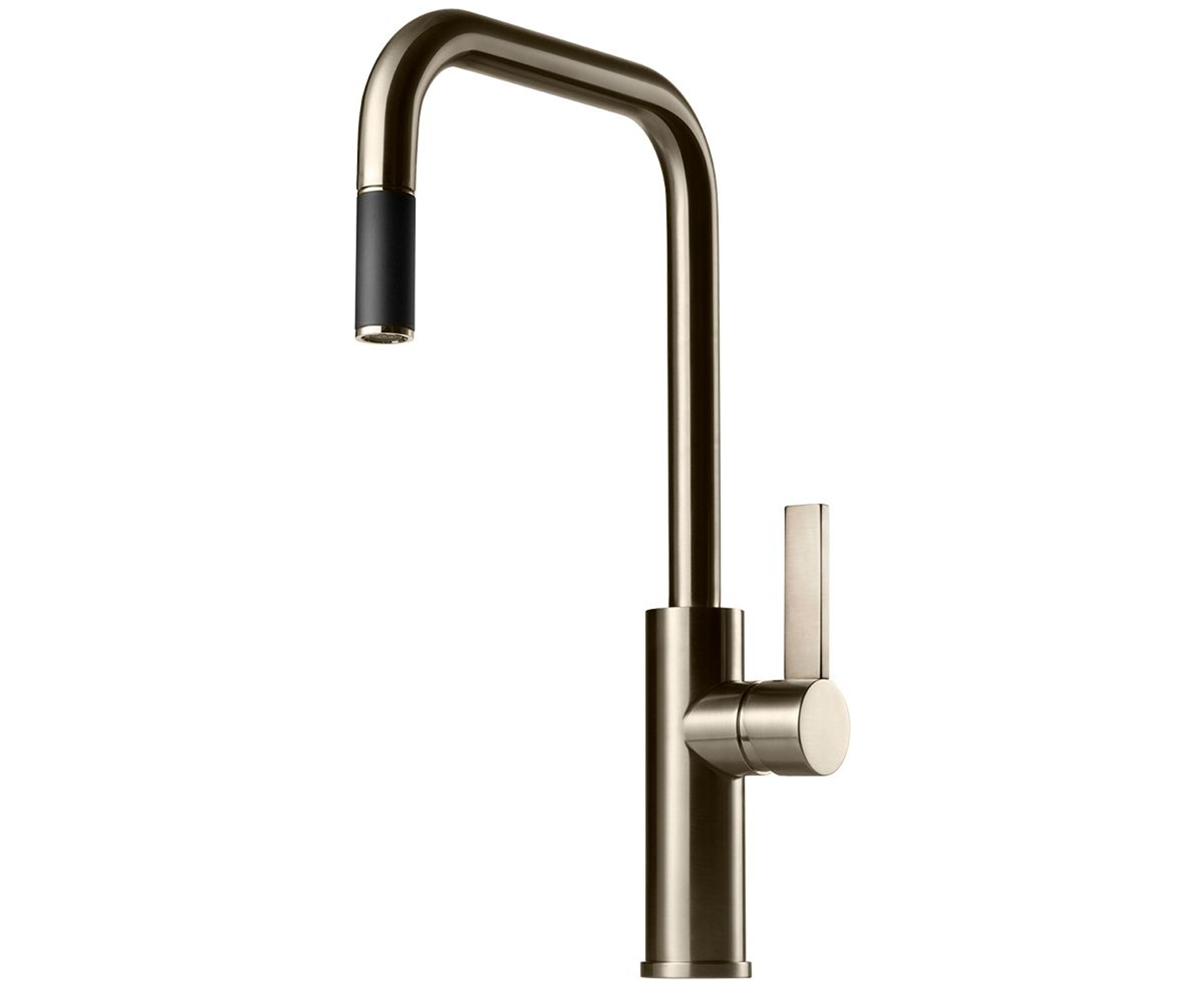 Kjøkkenbatteri med høy svingbar tut og uttrekkbar hånddusj. Farge: Brushed Nickel