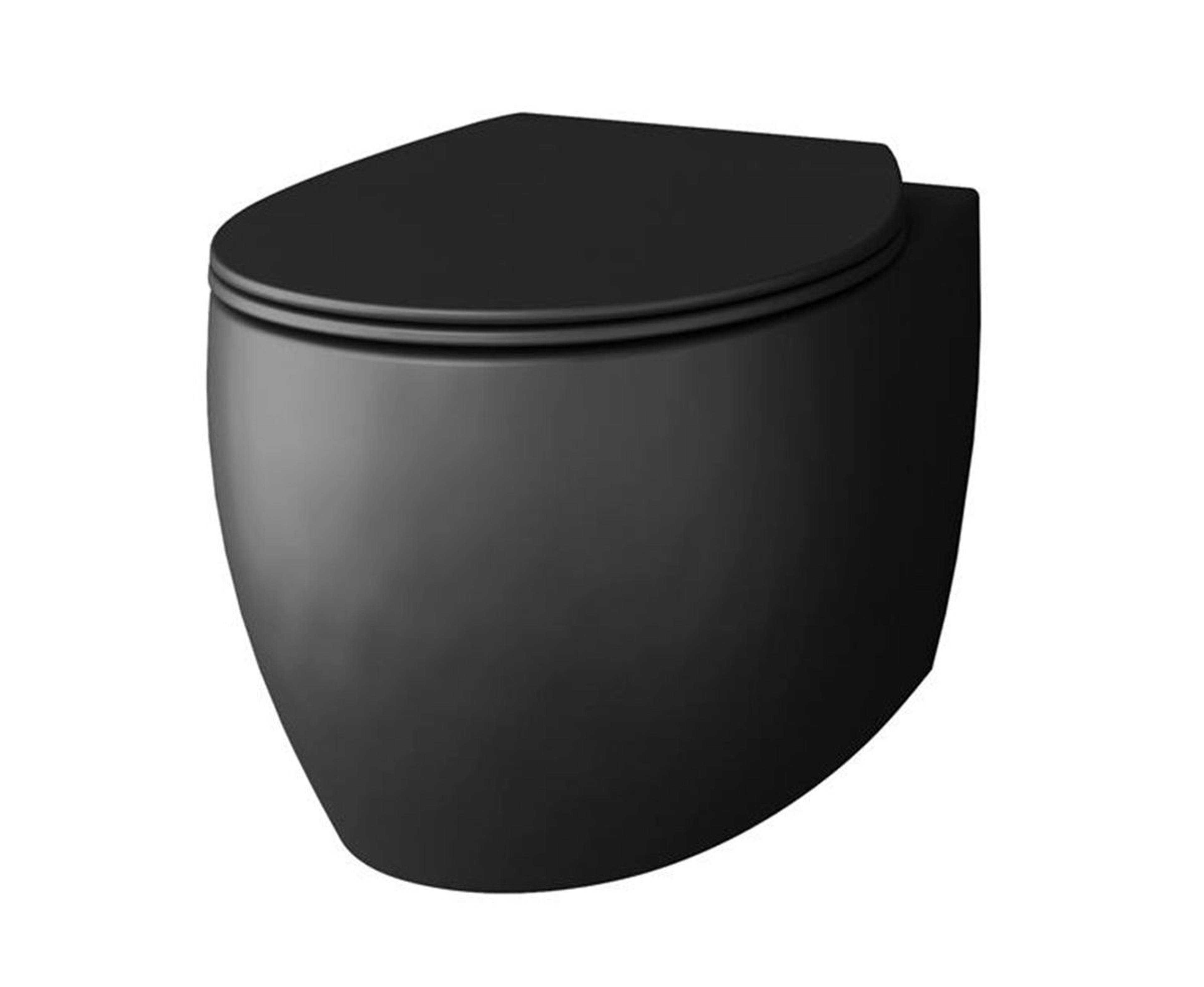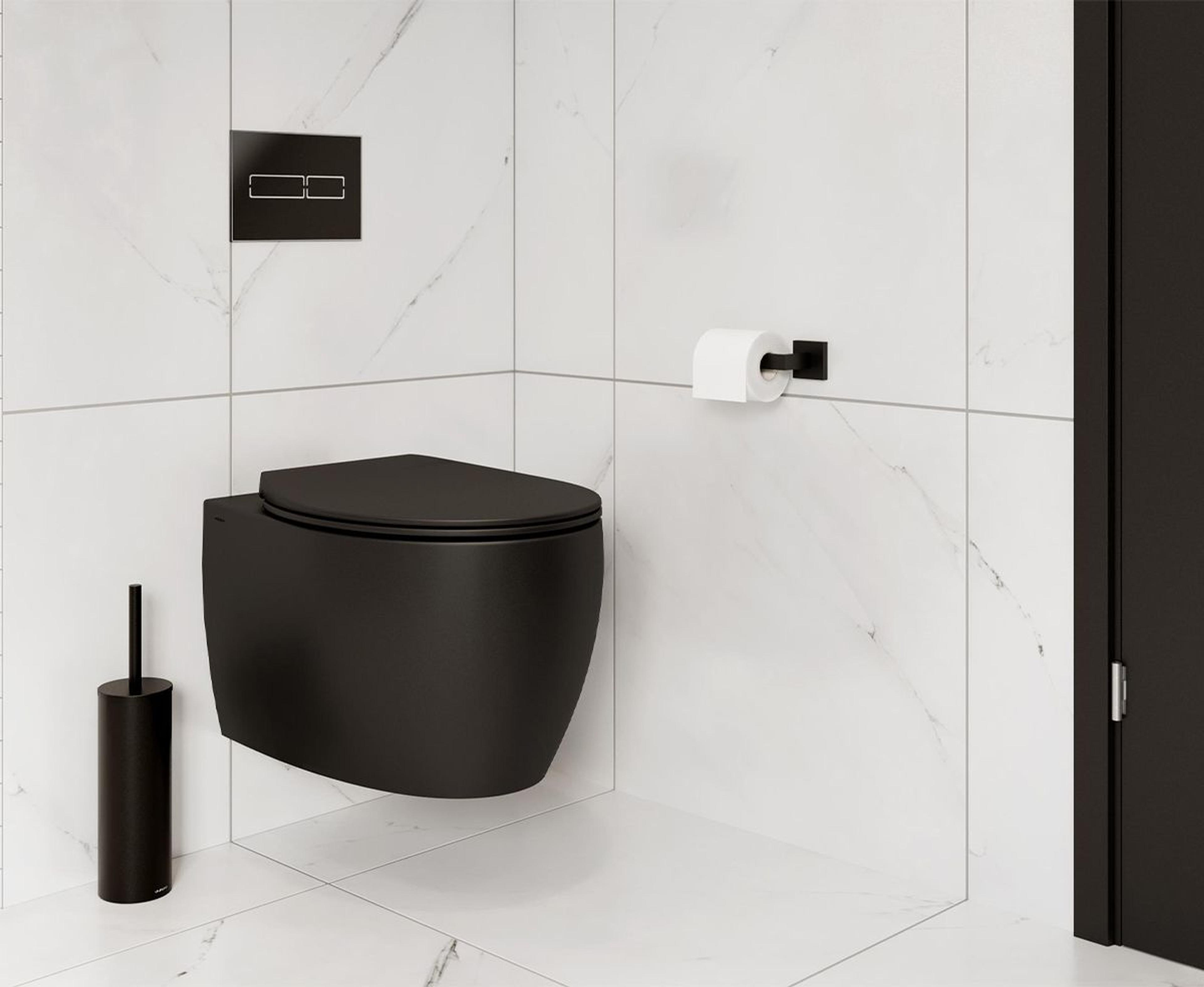 Vegghengt toalett med åpen spylekant og solid toalettsete med Soft Close og Quick Release. Soft Close funksjonen demper lyd og fart ved lukking av sete. Enkel montering og skjult oppheng. Farge: Svart matt