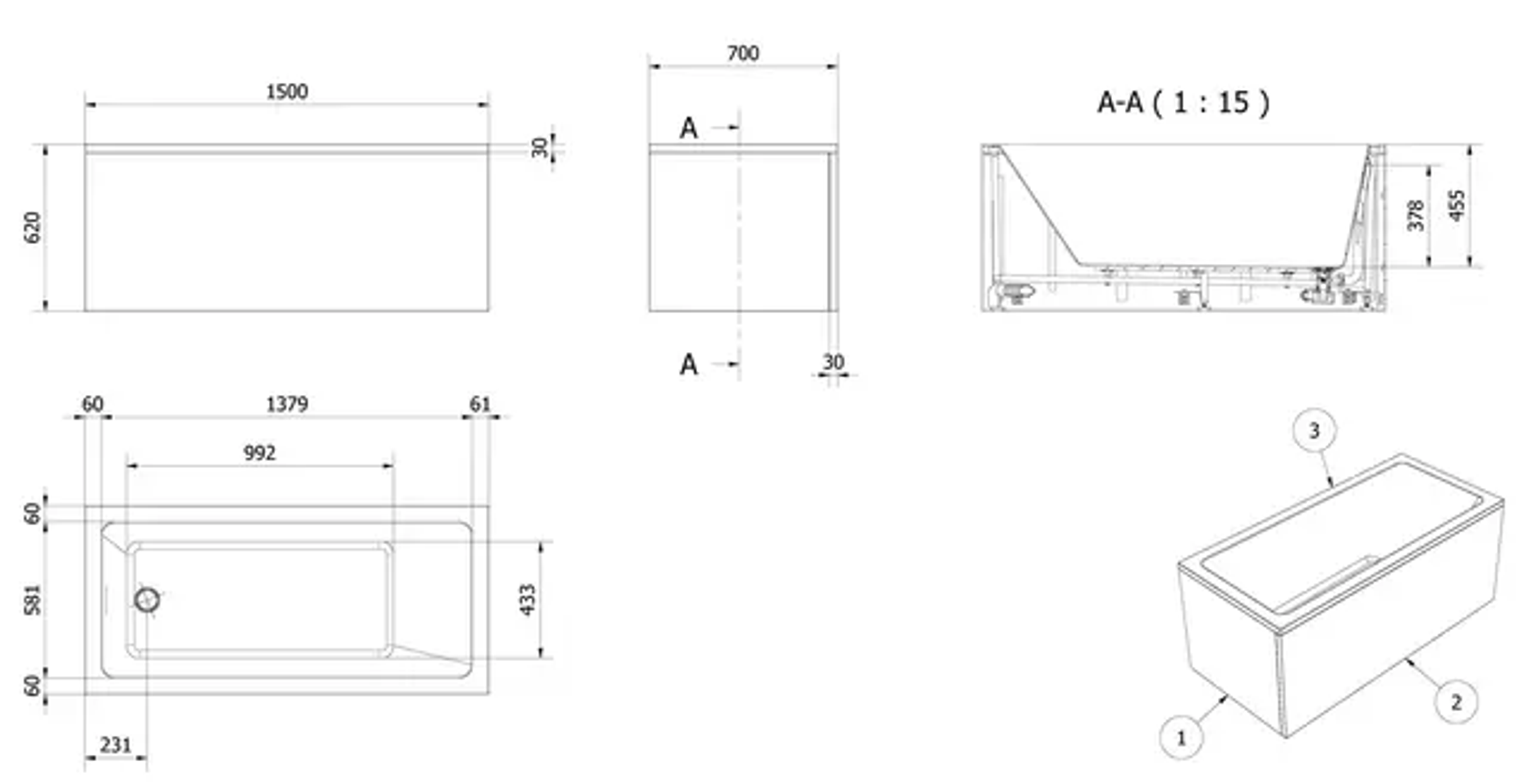 Badekar med stilrent slisset overløp og Pop-up avløp Denne modellen inkluderer front- og endepanel.