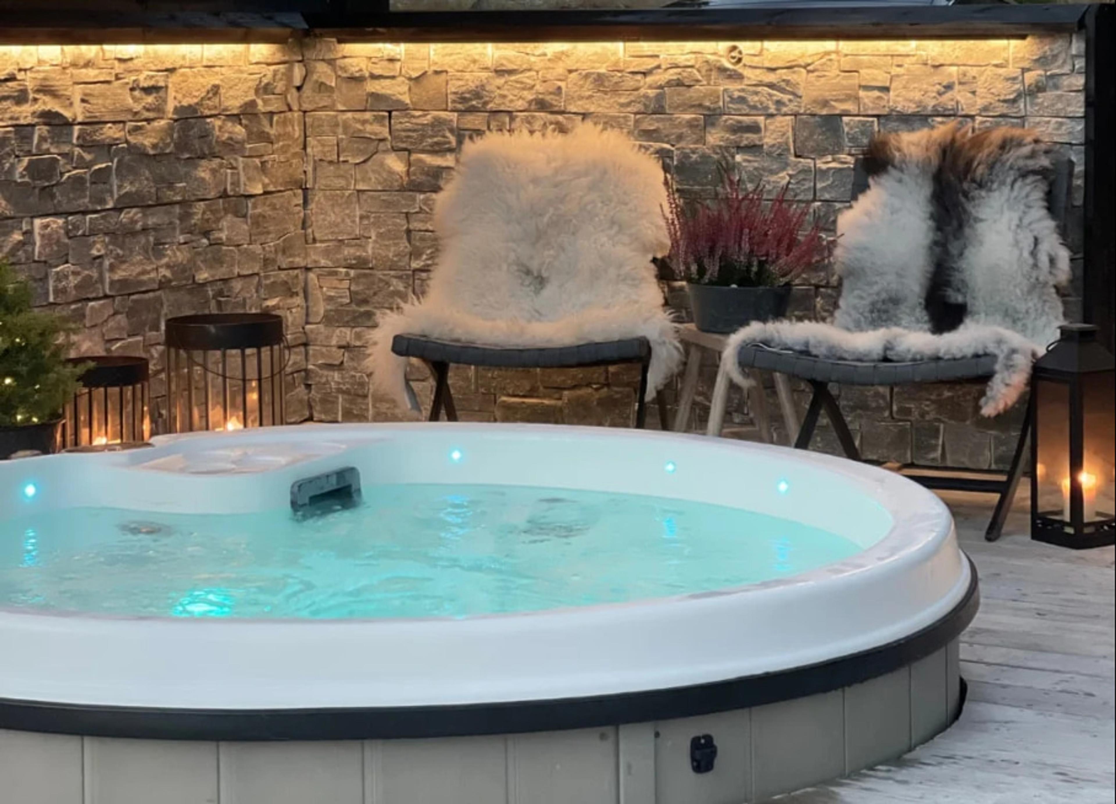 Livet på vinterhytta handler ikke bare om å sitte foran peisen. Det å kunne tilbringe tid ute er minst like viktig – og det trenger ikke bety lange skiturer. Med et utendørs massasjebad på terrassen kan du bare trekke på deg ullsokkene, gå ut i snøen og synke ned i det dampende, varme vannet mens snøfnuggene daler rundt deg.