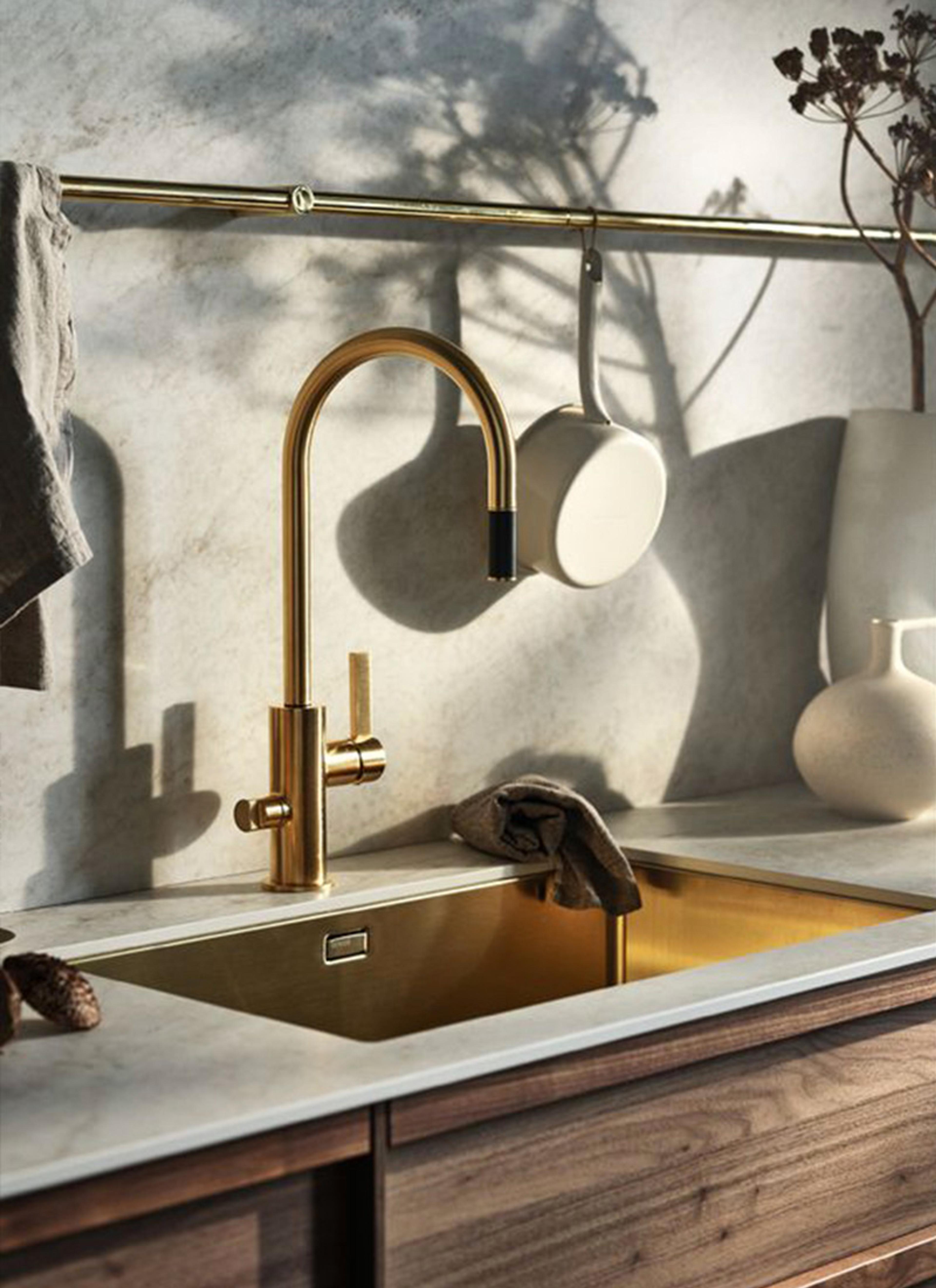 HVILKEN FARGE ER DU? Kjøkkenkranene fra Tapwell blir fort et blikkfang på kjøkkenet, og kommer i mange ulike overflater. | Tapwell ARM885 kjøkkenkran med uttrekkbar tut og avstengning i overflaten brushed honey gold.