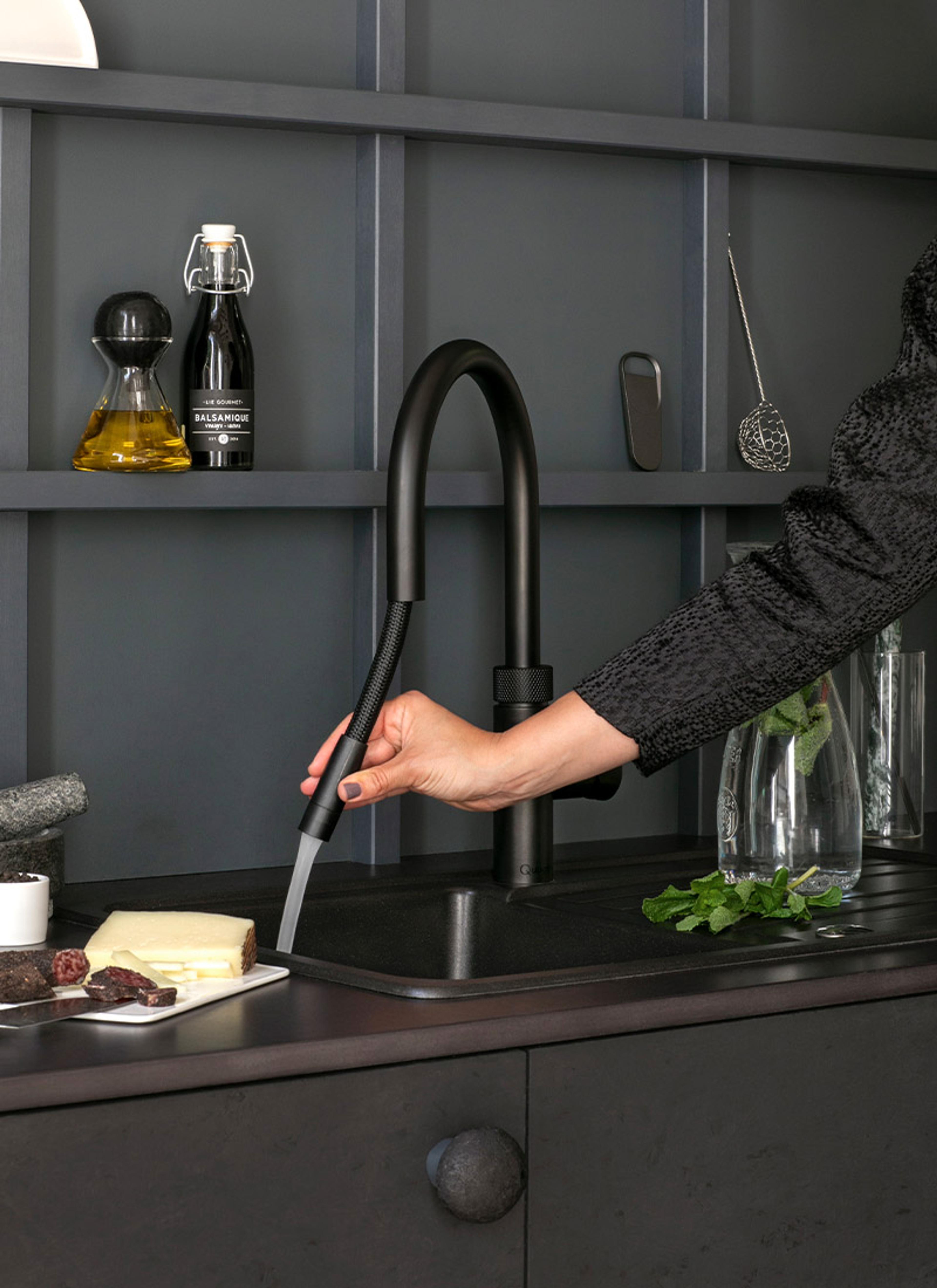FLERE-I-EN: Quooker Flex kjøkkenkran i sort har ikke bare uttrekkbar tut, men du får også varmt, kaldt og kokende vann rett fra springen. Ønsker du avkjølt vann og kullsyre har du muligheten til å få det også med tilleggsbeholderen Cube – smart, ikke sant?