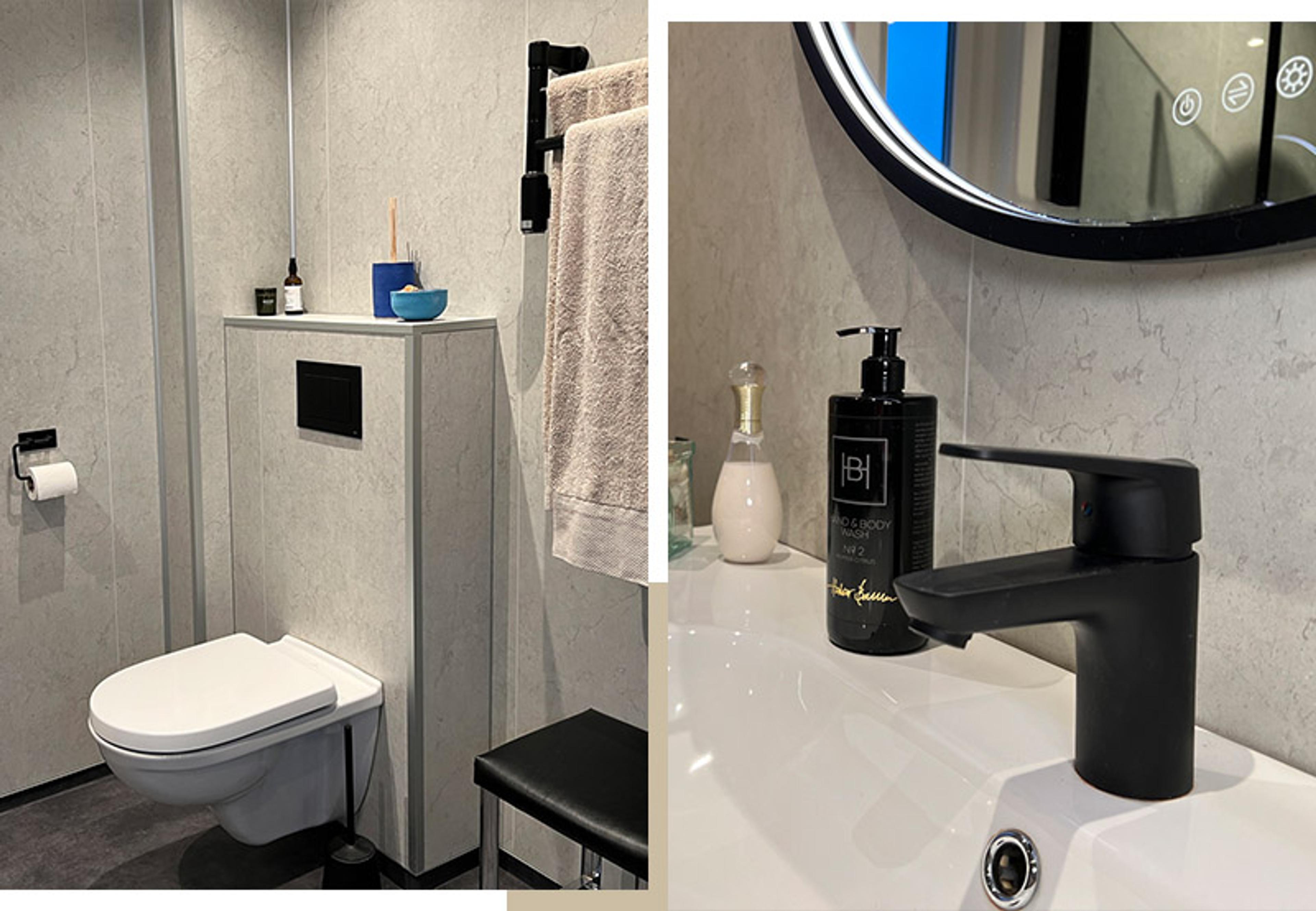 - Utvalget av baderomsplater og gulvbelegg har nærmest eksplodert, sammenlignet med utvalget for kun få år siden. Et bad skal være tett, og baderomsplater som er håndverksmessig satt opp er en løsning som varer, sammen med gulvbelegg i god kvalitet. Merete og Steinar valgte baderomsplater i en lys og delikat greige-tone på veggene. Gulvbelegget i en mørkere gråbrun fargetone løfter frem de sorte detaljene ellers på badet.