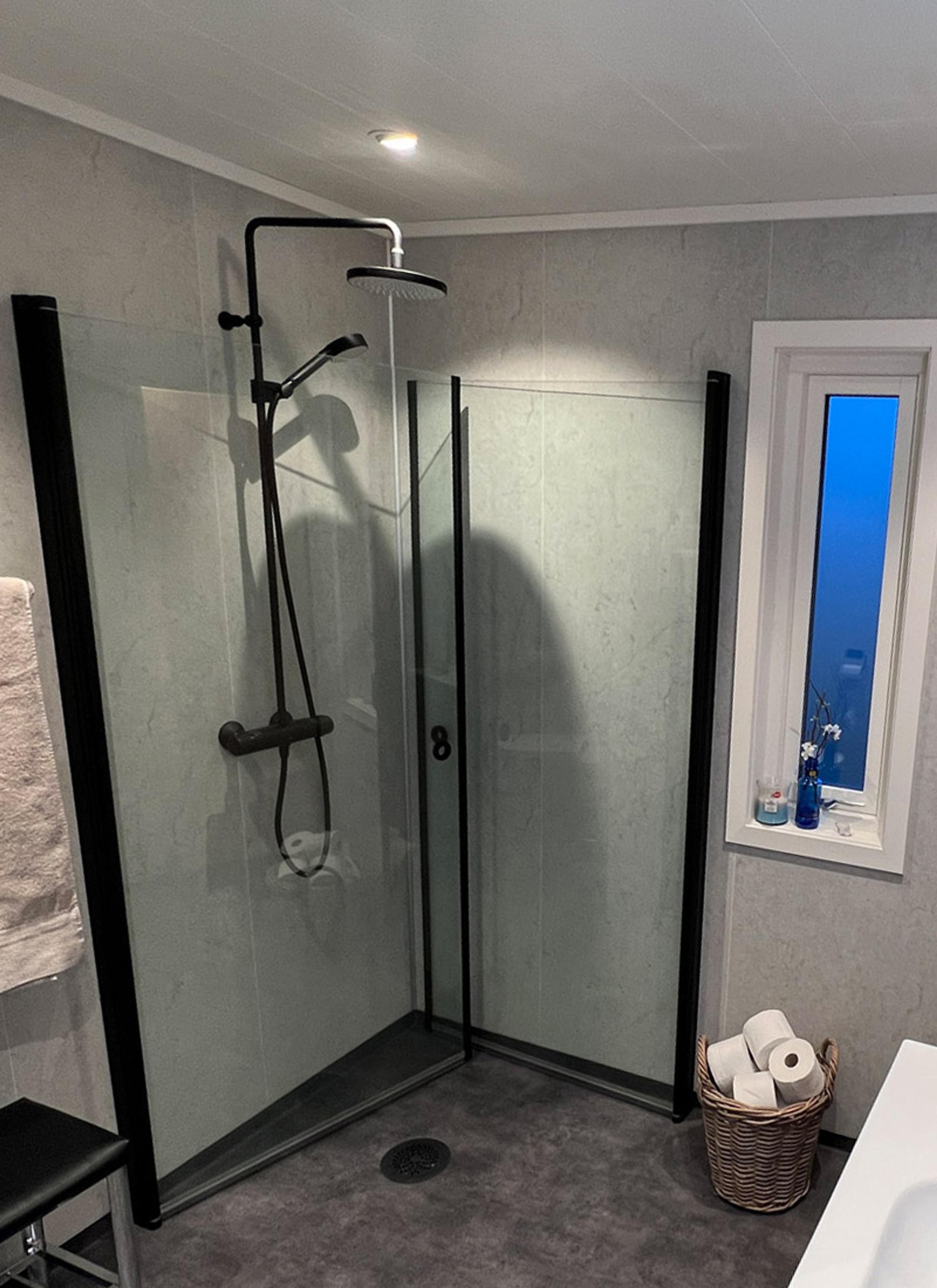 ROMLIG DUSJOPPLEVELSE: Dusjveggene fra INR kan slås innover når de ikke er i bruk og gir ekstra gulvplass på det seks kvadratmeter store badet. Også her går de sorte detaljene igjen, med sorte dusjprofiler og Oras Nova rainshower takdusj i sort matt. Gulvbelegget er Tarkett Aquarelle i fargen kiruma charcoal.