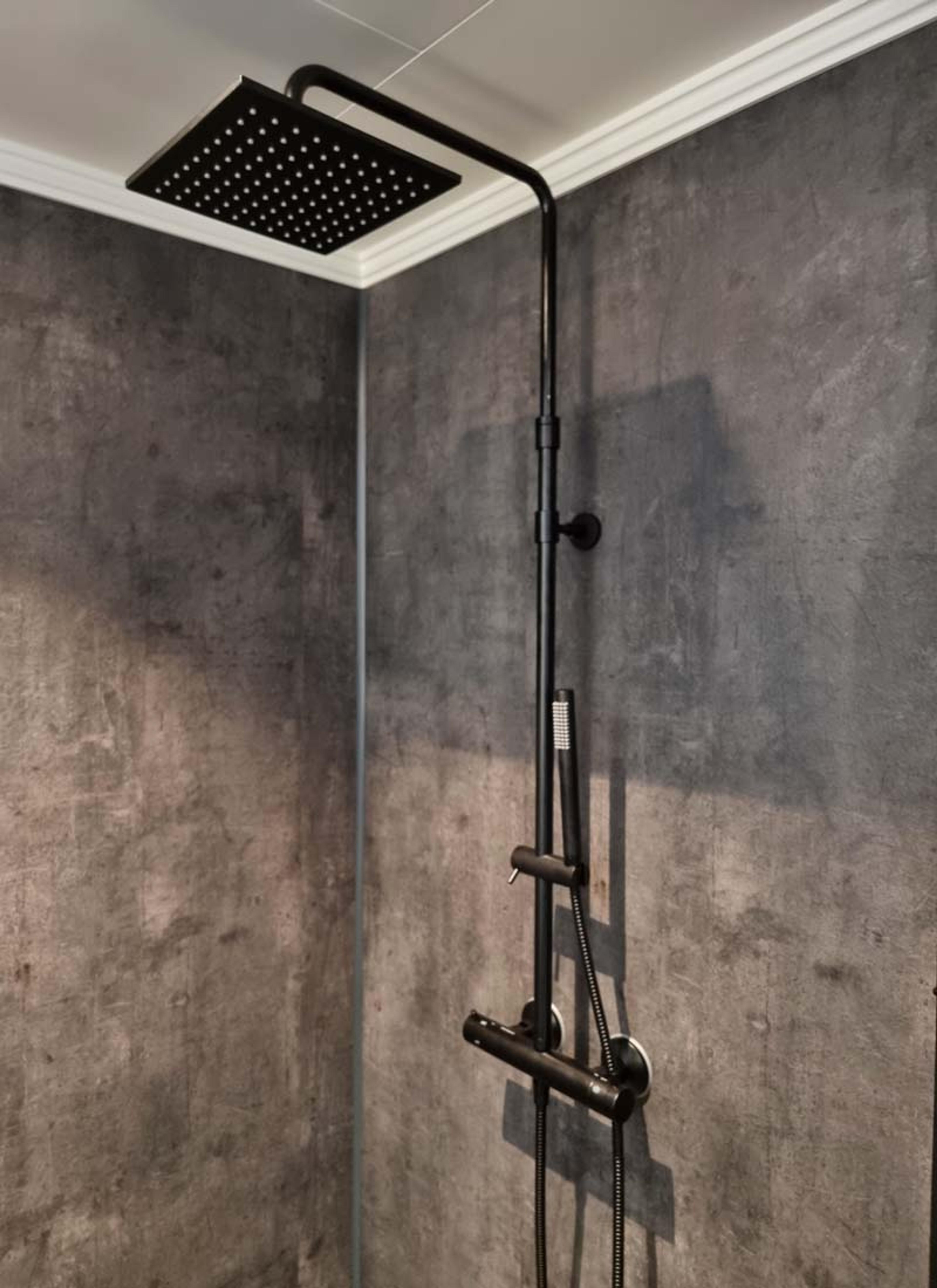 STOR, SORT SKJØNNHET: Paret gikk for et stort dusjhjørne med sorte profiler. Takdusjen fra VikingBad er i samme utførelse som servantbatteriene, og designsluket fra Purus fremhever detaljene på en stilig og gjennomført måte. | INR LINC Angel dusjhjørne i sort matt, INR Pile dusjoppbevaring i sort matt.