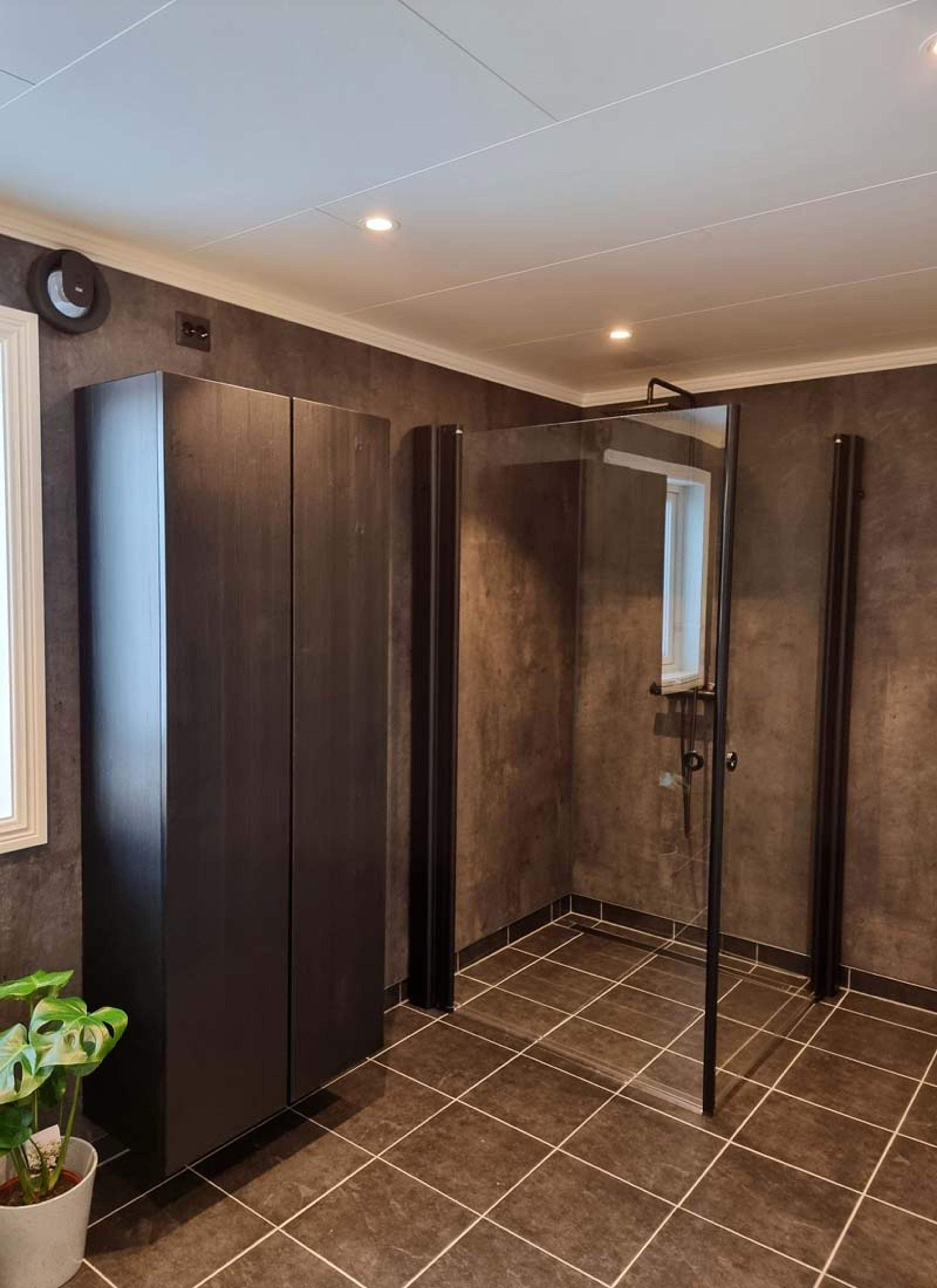 Vilde og Yngvar var veldig klar på at de ønsket seg en stor dusj nå som baderommet skulle bli større. Løsningen de valgte var hjørnedusj fra INR på hele 1,1 x 1,1 meter med sorte profiler og integrerte oppbevaringshyller på hver side. De praktiske oppbevaringshyllene skjuler alle dusjproduktene og holder orden i dusjsonen.