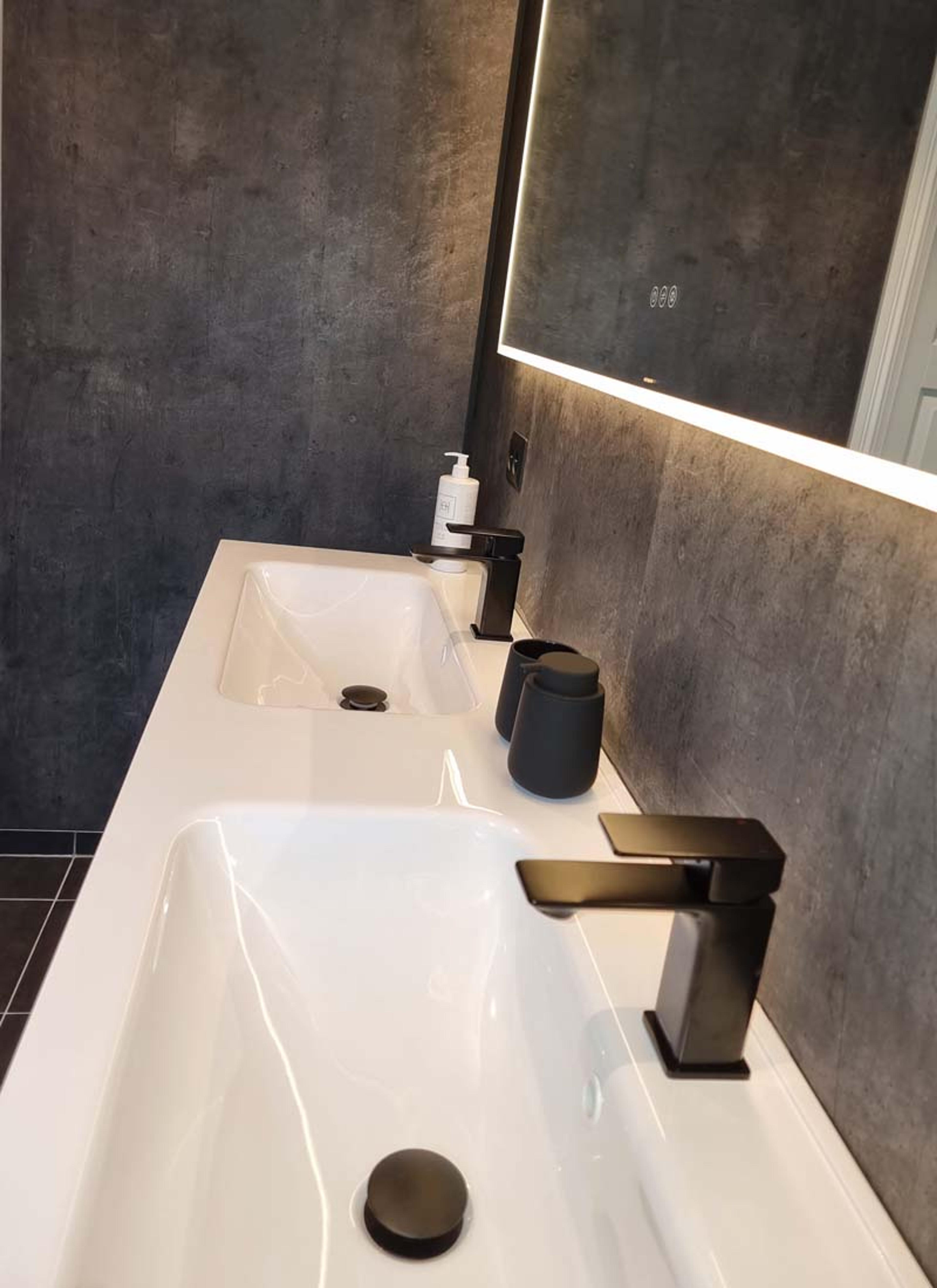 Med baby i vente hadde paret et behov for et større baderom, med god plass til stellebord og gode oppbevaringsmuligheter. Med familieforøkelsen, og med tiden mer kamp om plassen, ønsket de seg en dobbel servant og matchende servantbatterier fra VikingBad.
