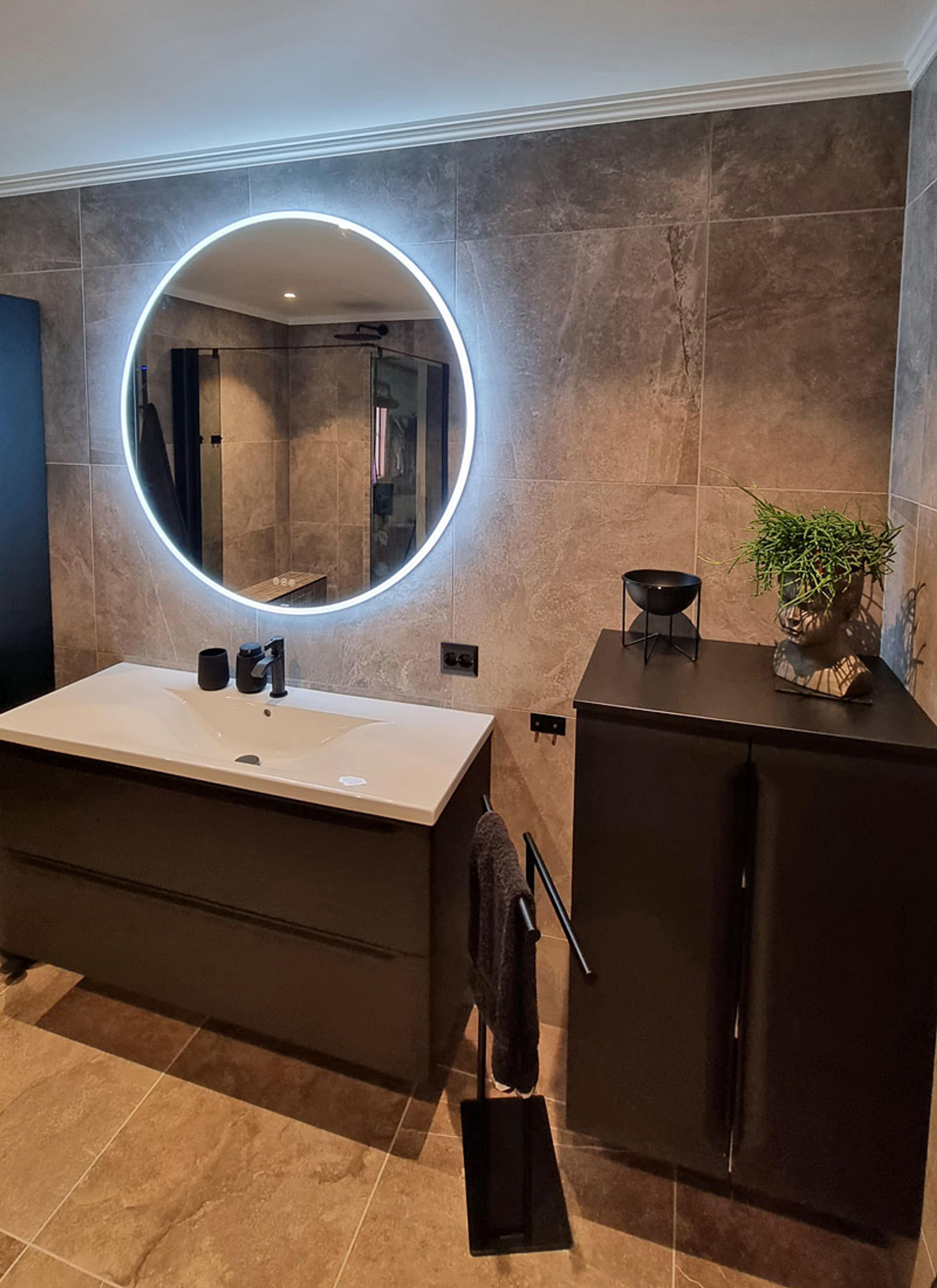 MYE OPPBEVARING: Ekteparet har valgt norskproduserte baderomsmøbler fra Linn Bad med både dype skuffer, side- og høyskap. | Linn Bad Mari baderomsmøbler i sort matt med integrerte håndtak, og VikingBad Oda speil med integrert belysning.