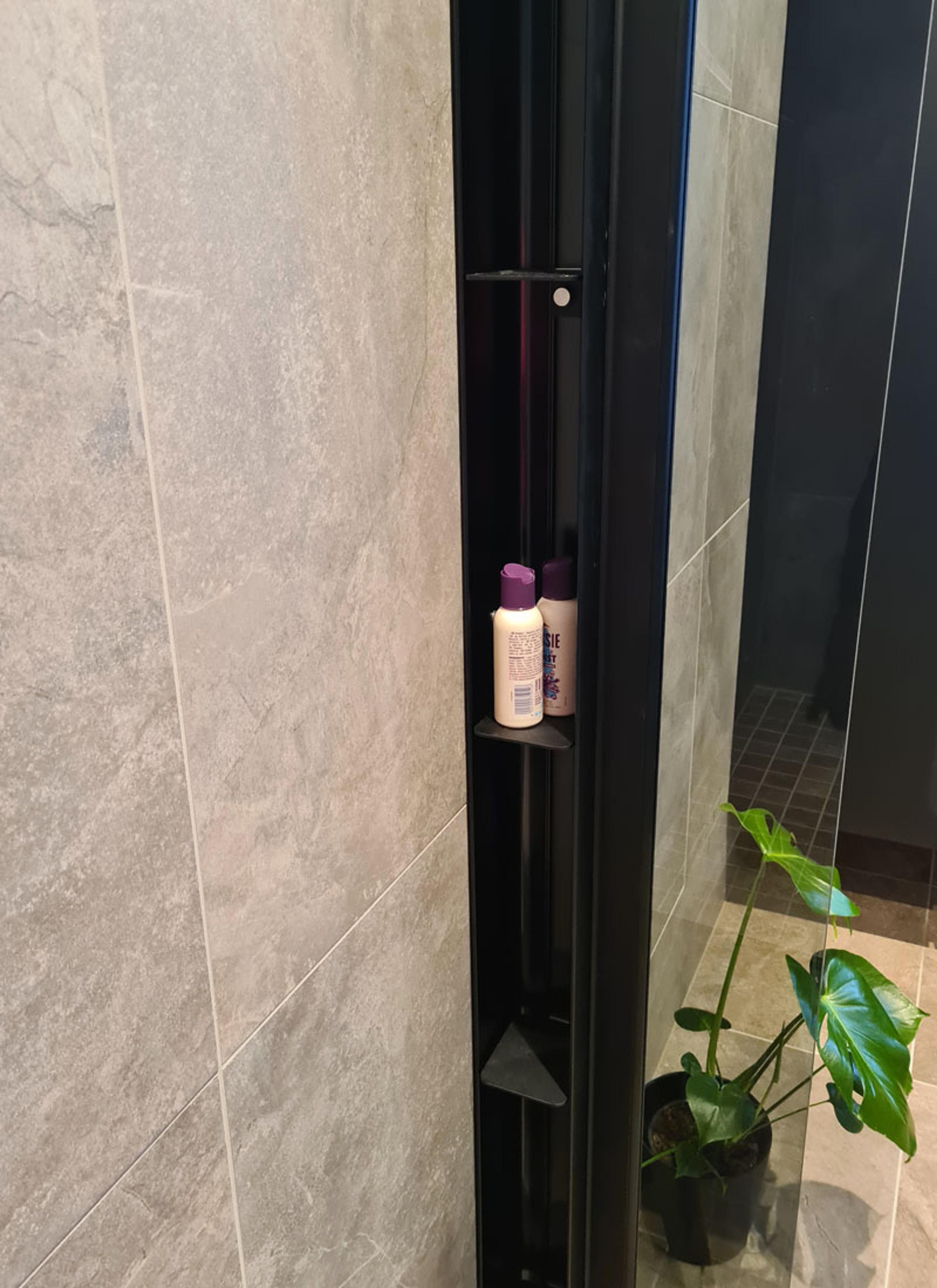 SKJULT DUSJOPPBEVARING: Med INR PILE dusjoppbevaring skjult i selve dusjprofilen, kan du elegant oppbevare sjampo- og såpeflaskene. Hyllene er flyttbare, så selv de største flaskene får plass!