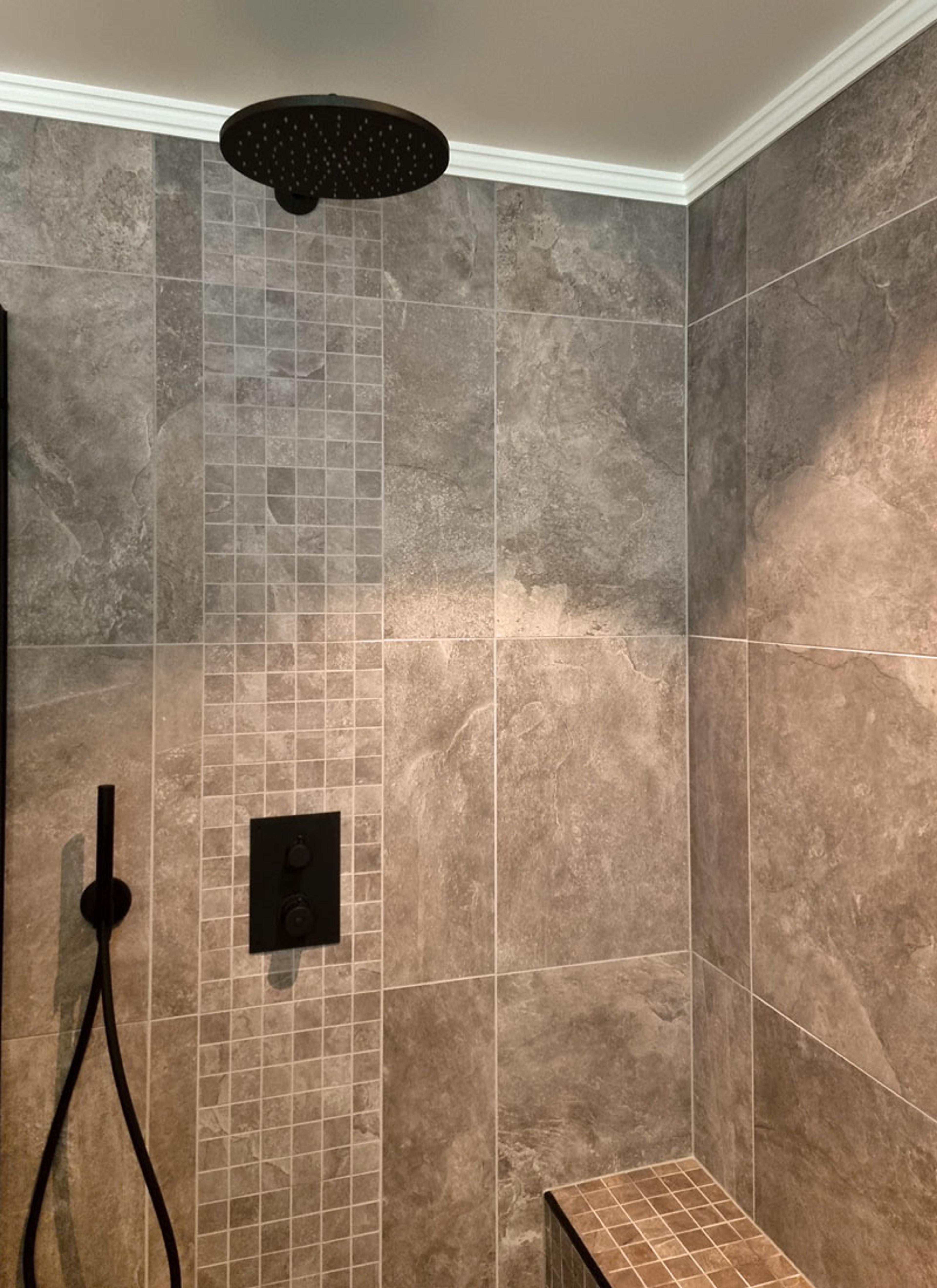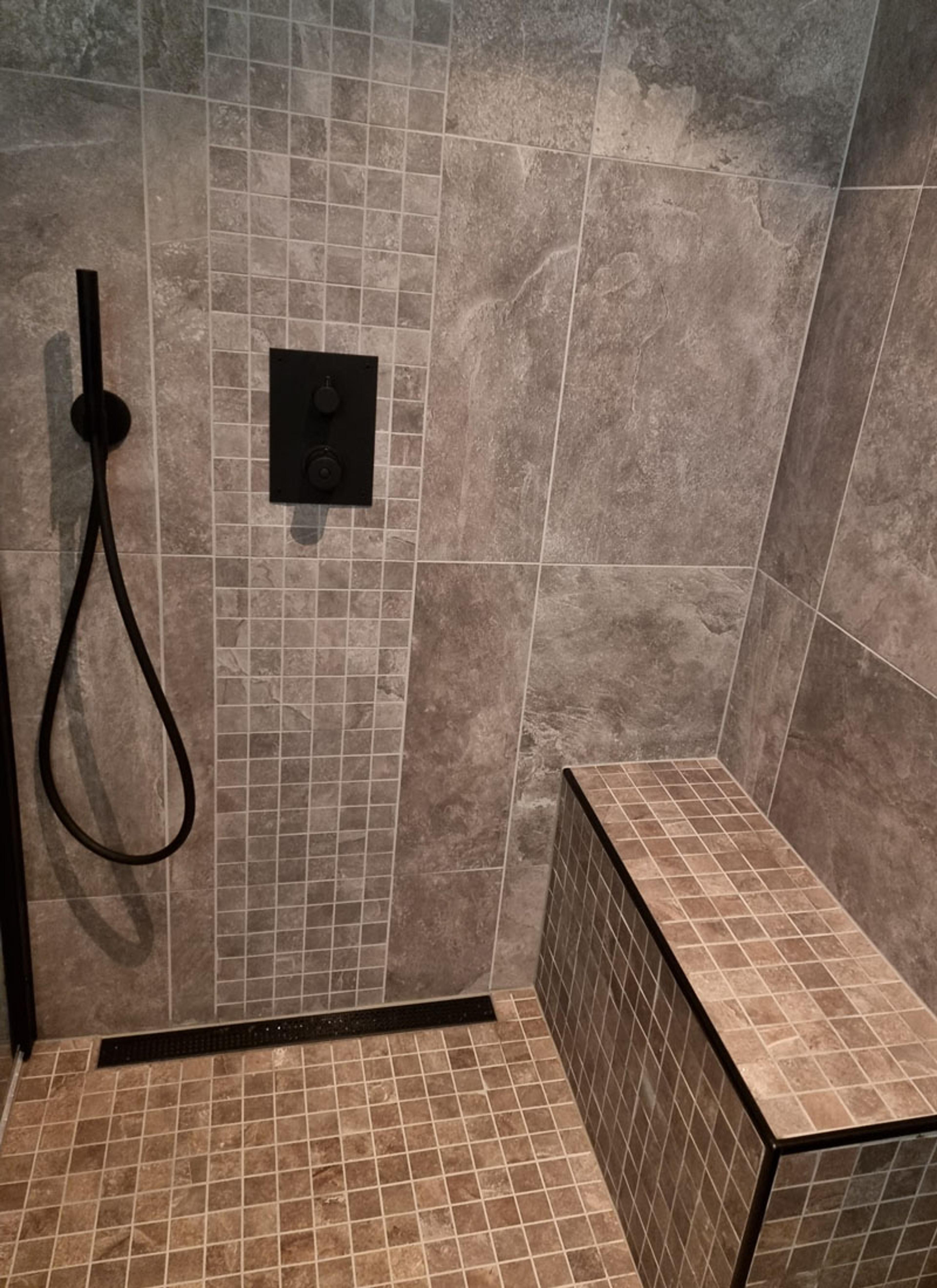Ekteparet var helt fra starten klar på at de ønsket en romslig dusj med sittebenk. De valgte å bryte opp de store flisene på badet med mosaikk på dusjgulvet, sittebenken og i et felt bak den moderne integrerte takdusjen - resultatet ble utrolig lekkert!