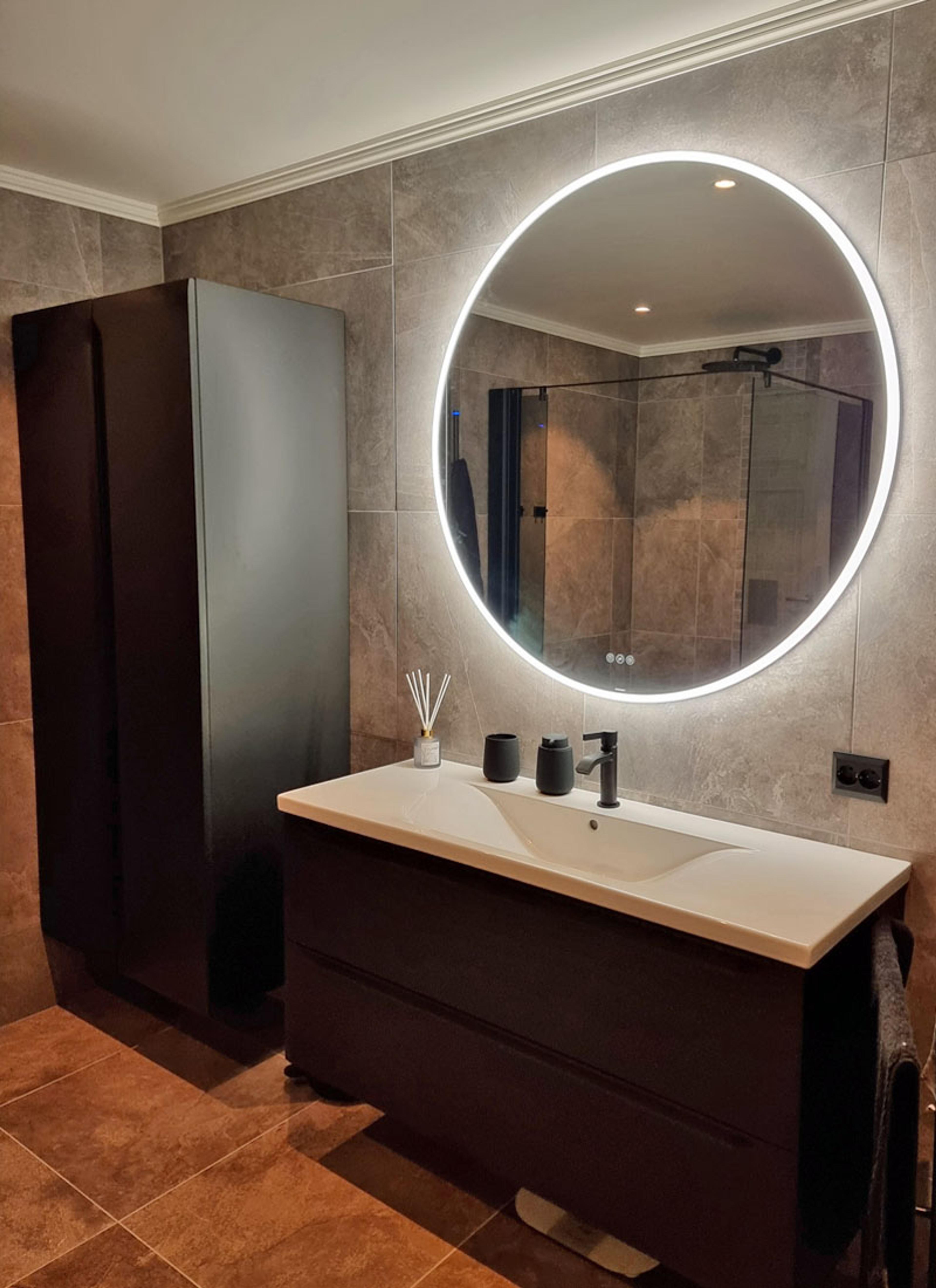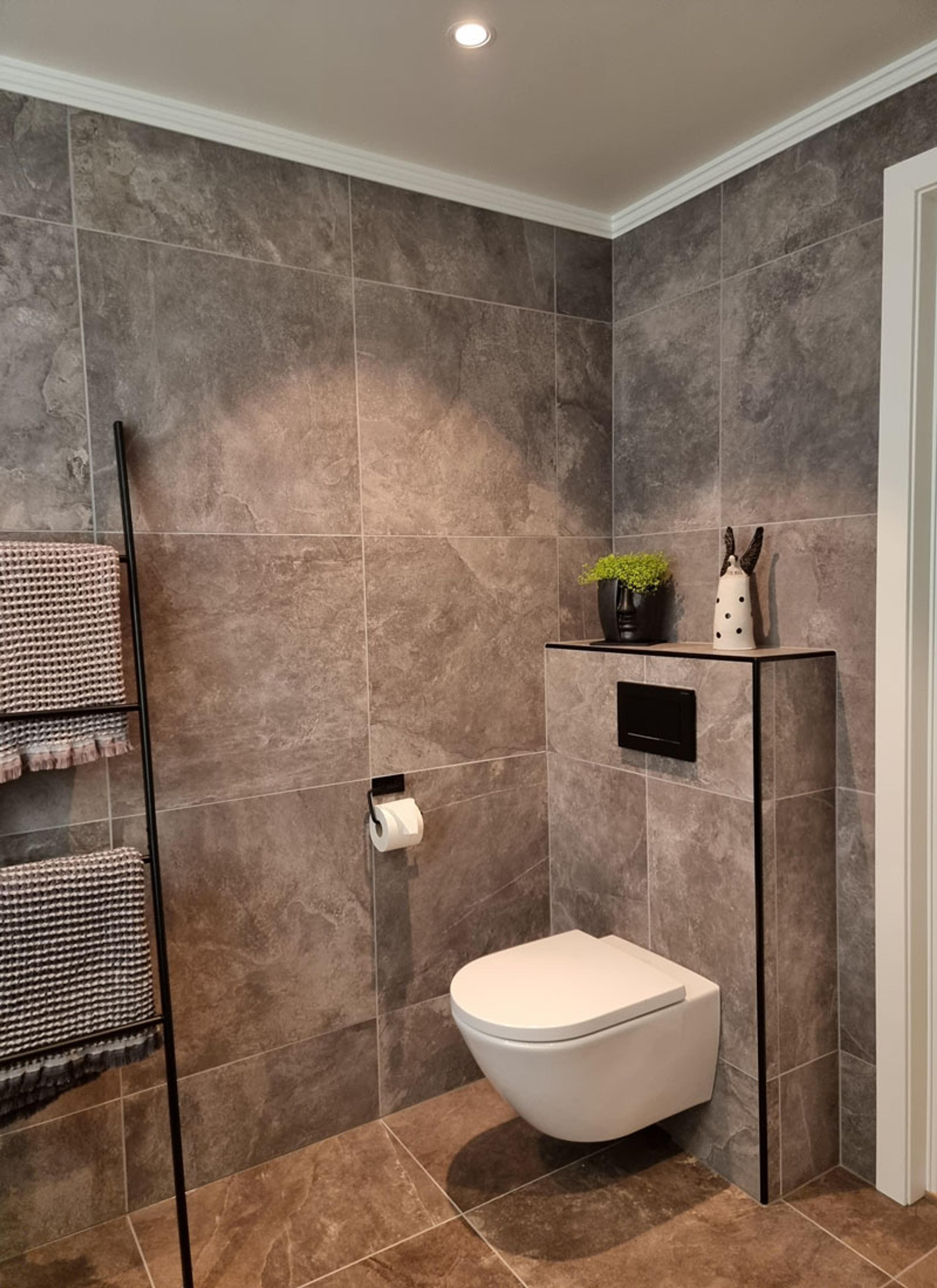 I starten så Bjørg og mannen for seg at badet burde være lunt, mørkt og mystisk, men når valget av flis skulle tas falt de for noen lysere i to forskjellige grå- og bruntoner mens de beholdt sorte møbler og detaljer. Det ble en fin kontrast.