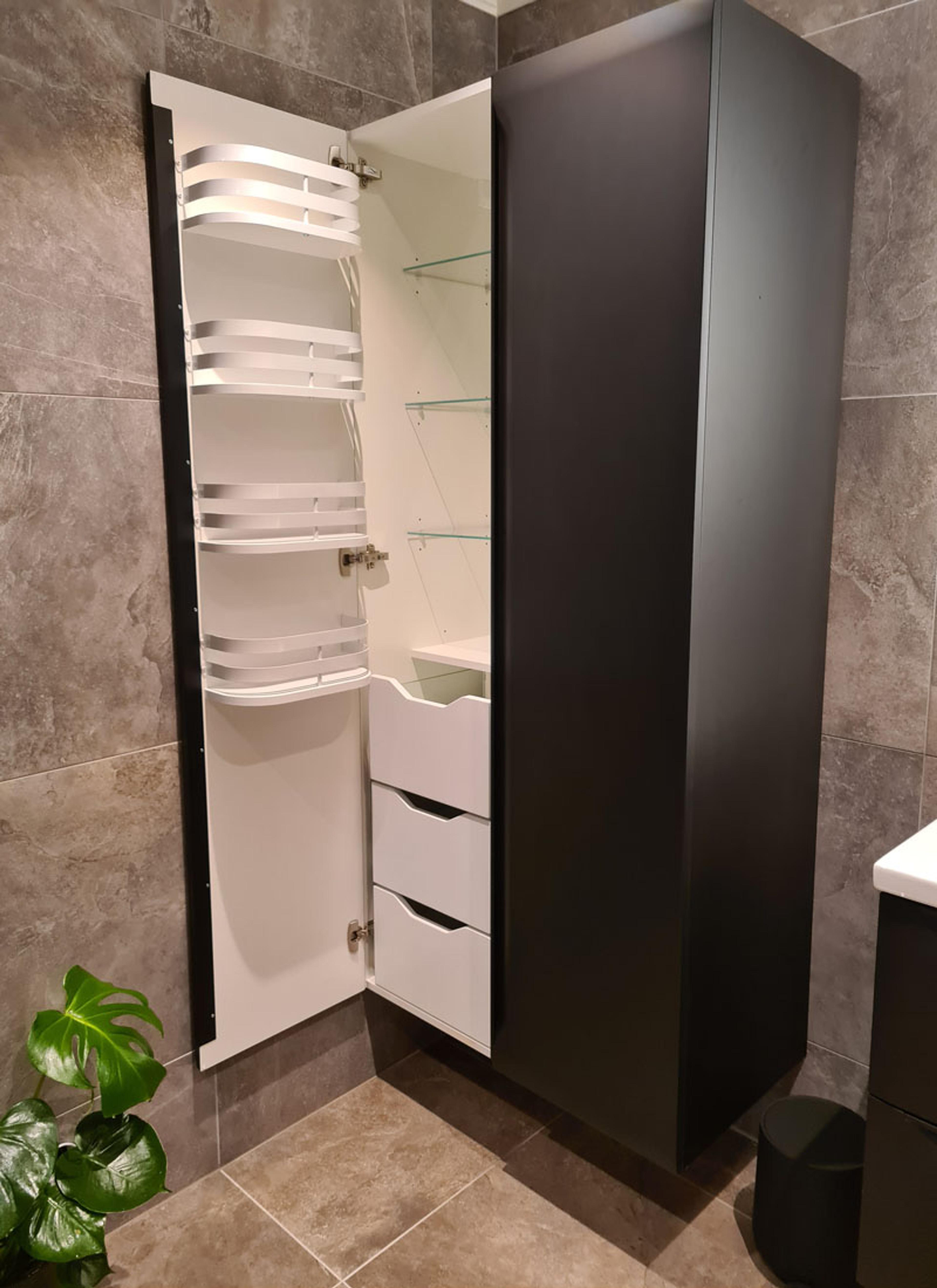 Gode oppbevaringsmuligheter var også viktig i planleggingen av nytt bad. Det gjestfrie ekteparet ønsket at badet like mye skulle være til glede for gjester etter et behagelig besøk i parets utespa, som for dem selv. Da er det greit å ha god plass til ekstra håndduker.