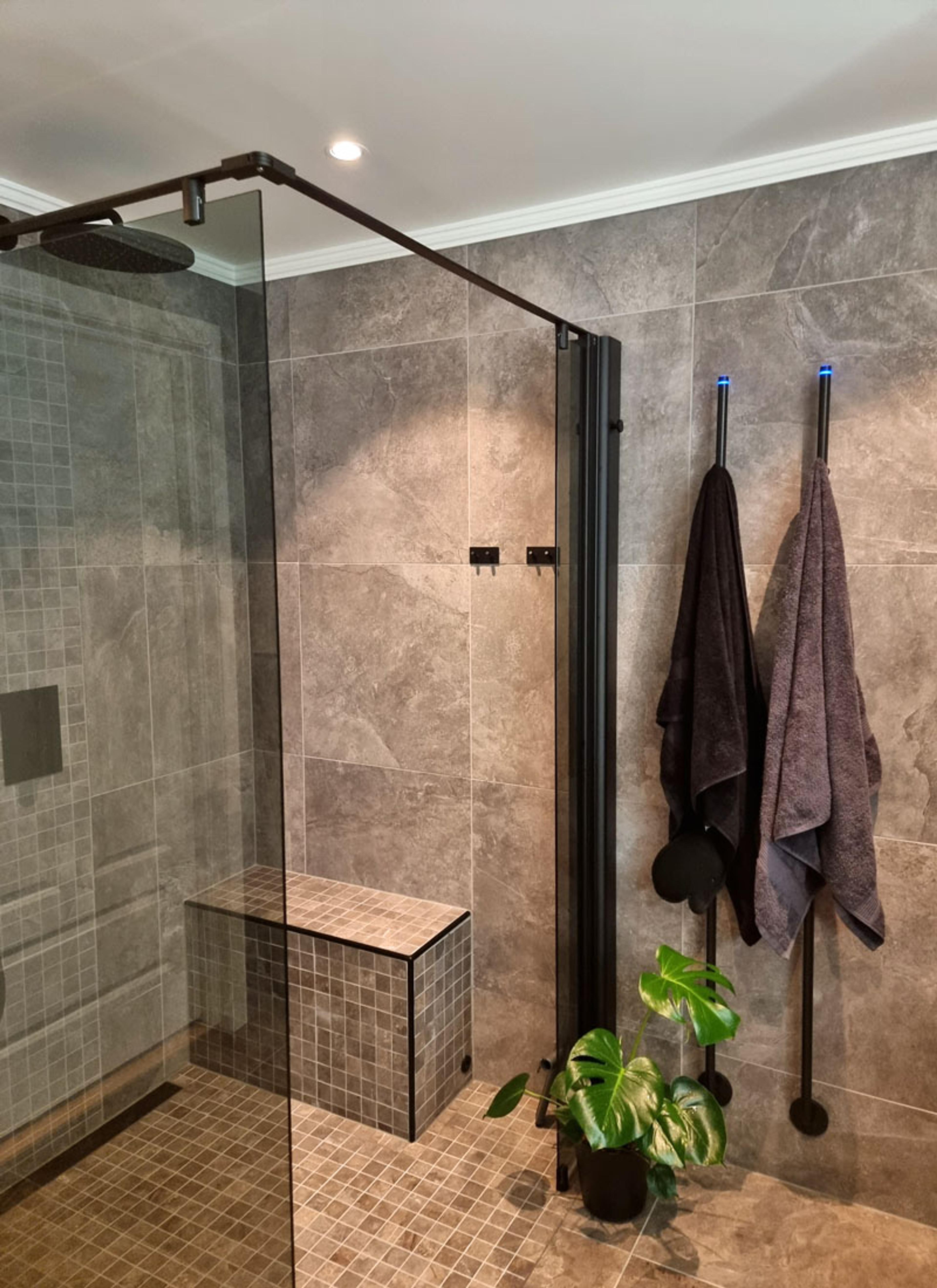 PRAKTISK OG ELEGANT: Ekteparet har gått for en måltilpasset INR LINC 20 dusjløsning samt praktiske og elegante funksjoner som sittebenk og skjult dusjoppbevaring i selve dusjprofilen. Ved siden av dusjen har to elektriske LINC Line håndkletørkere fra INR fått plass – noe som både gir varme håndklær etter en varm og god dusj samt at håndklærne tørker fortere etter bruk. Vinn-vinn med andre ord!