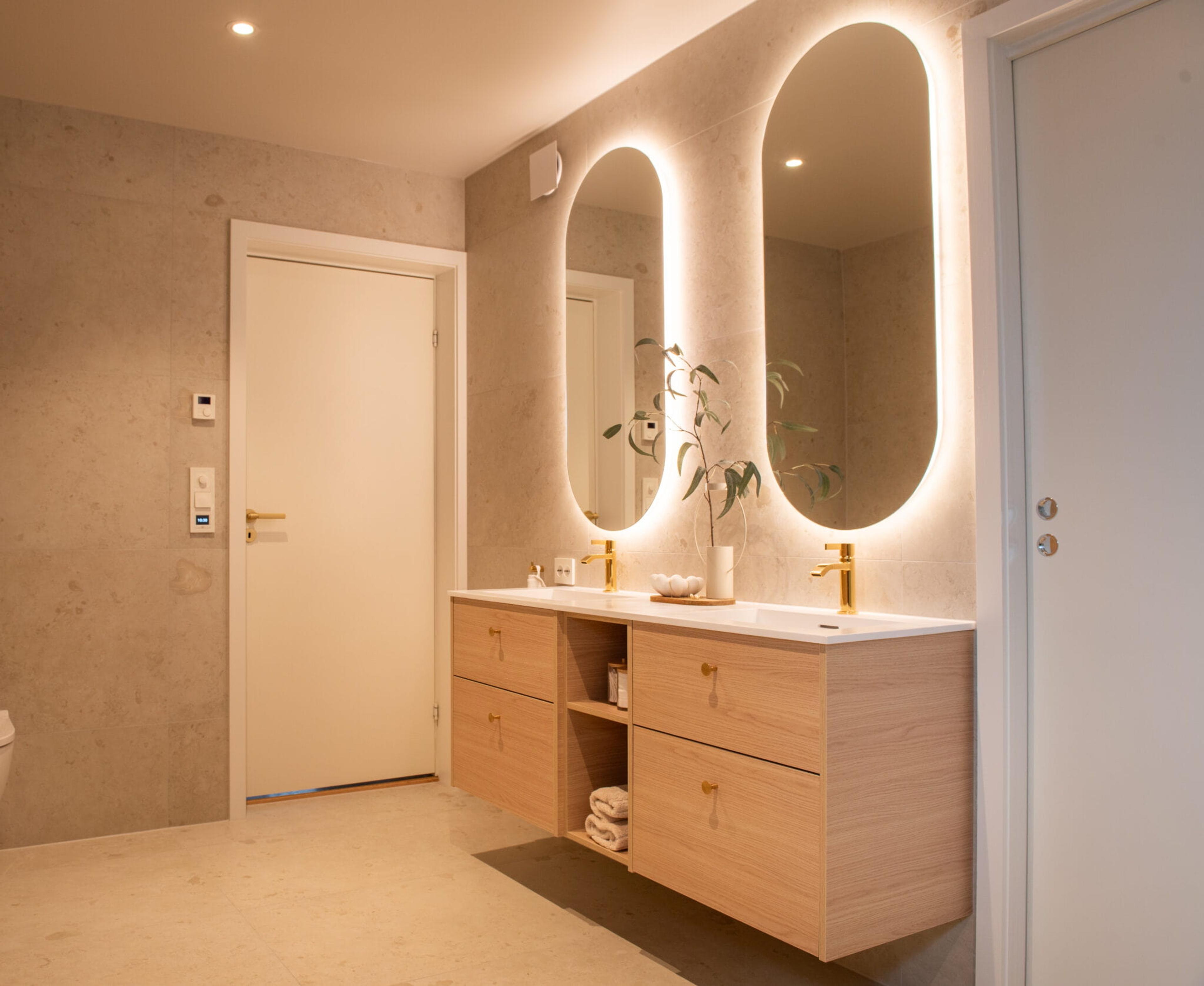 Hun valgte serien Innovent i utførelsen Lys Eik, en spesialtilpasset løsning med dobbel servant og åpne hyller i midten. Løsningen gir både estetikk og oppbevaringsplass – og gir rommet en harmonisk og åpen følelse.